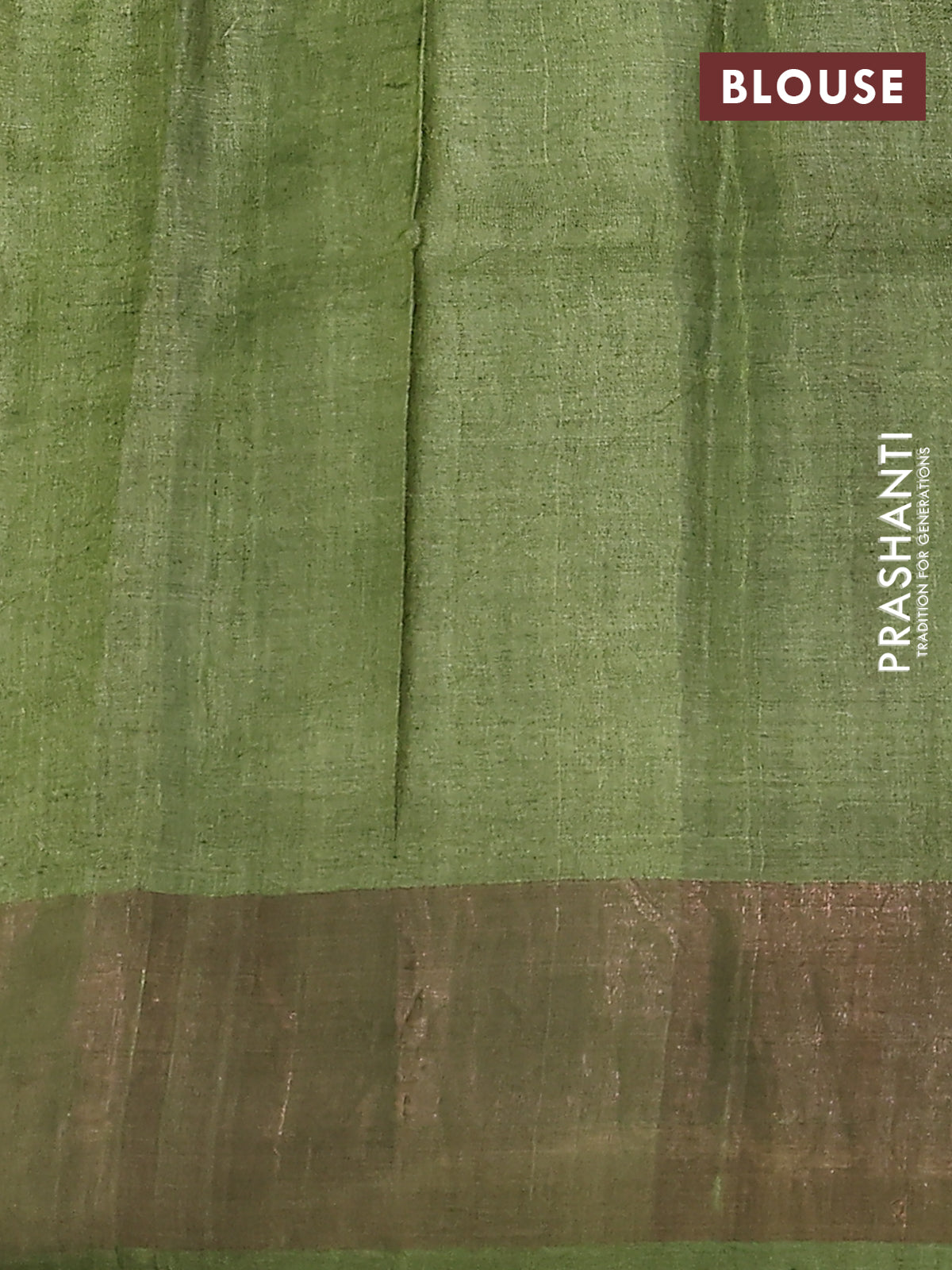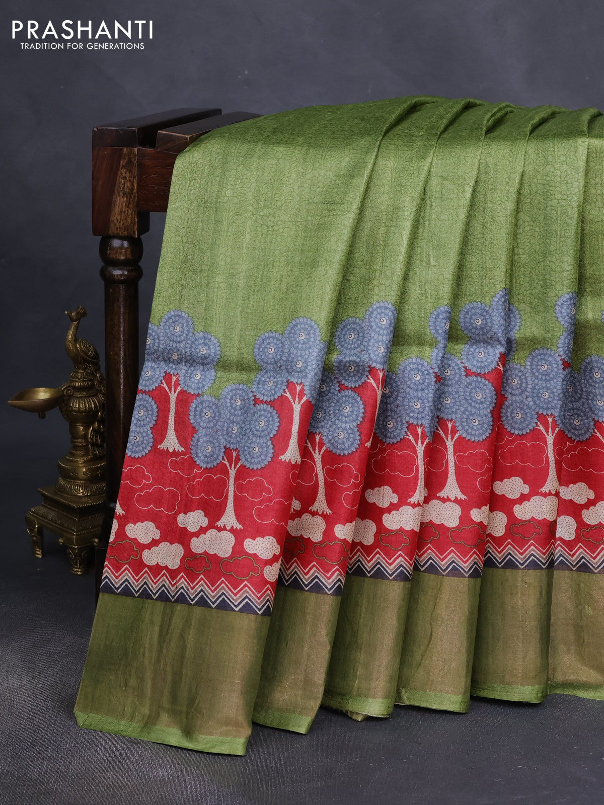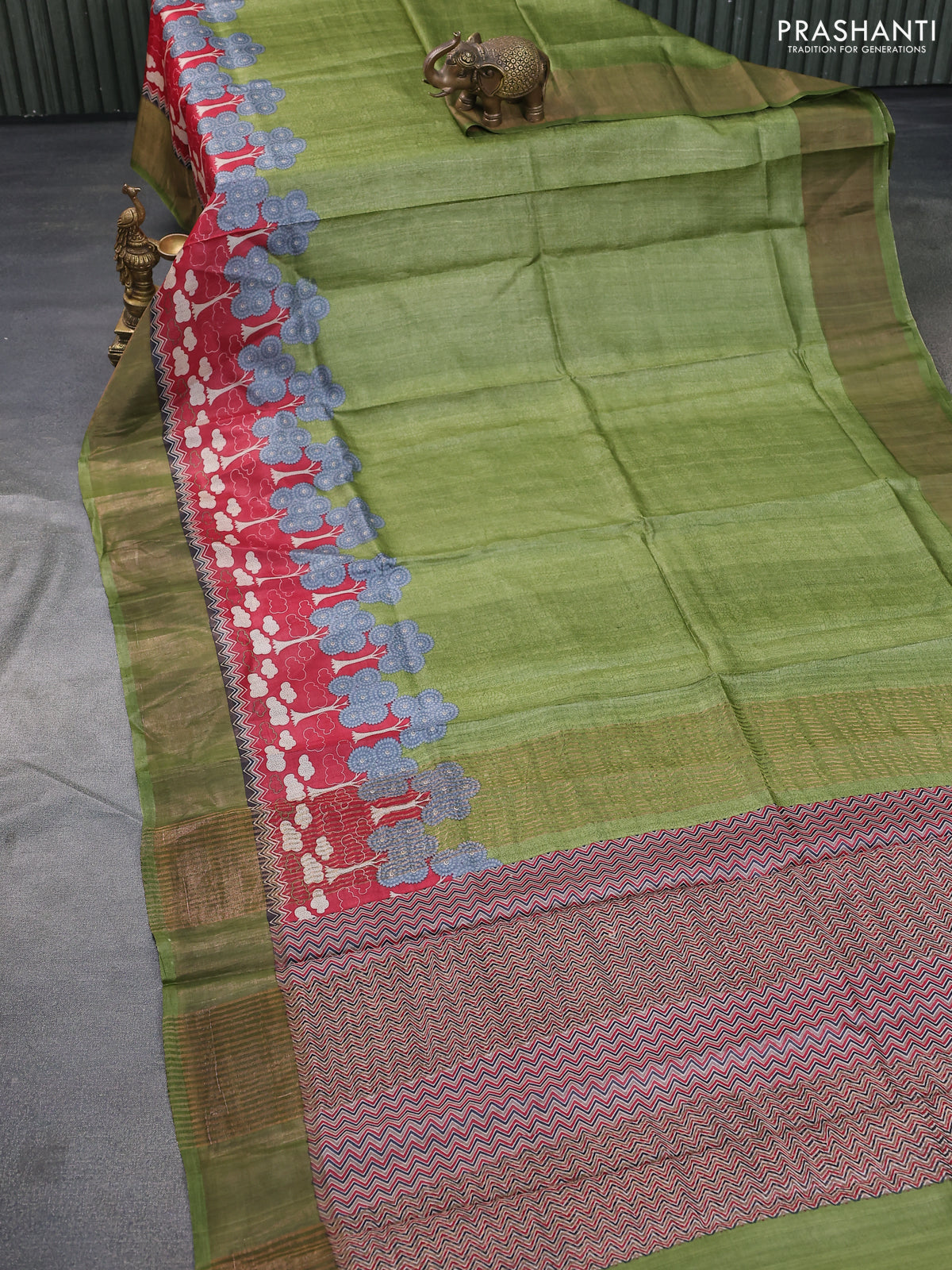 Pure tussar silk saree green and red with allover prints and zari woven border