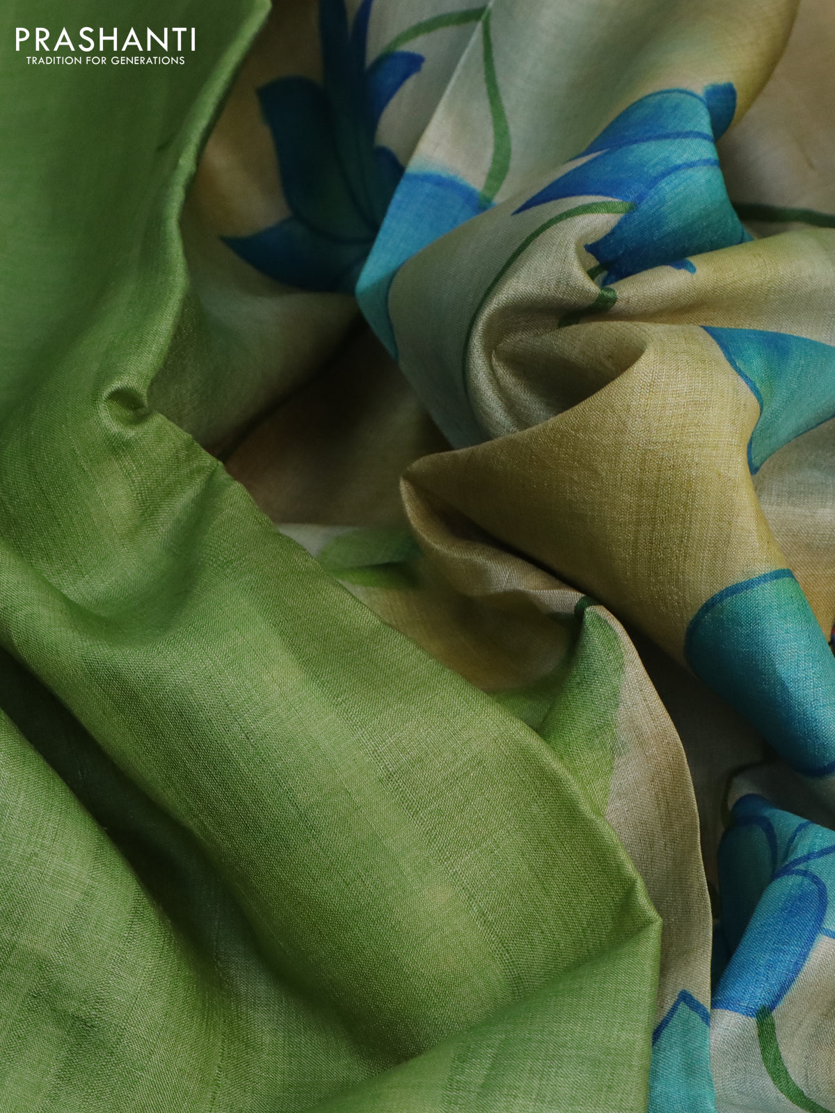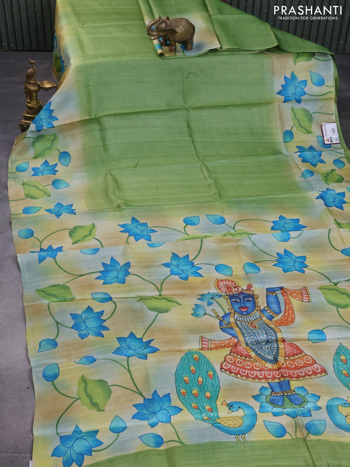 Pure tussar silk saree green and sandal with plain body and pichwai hand painted pallu & border