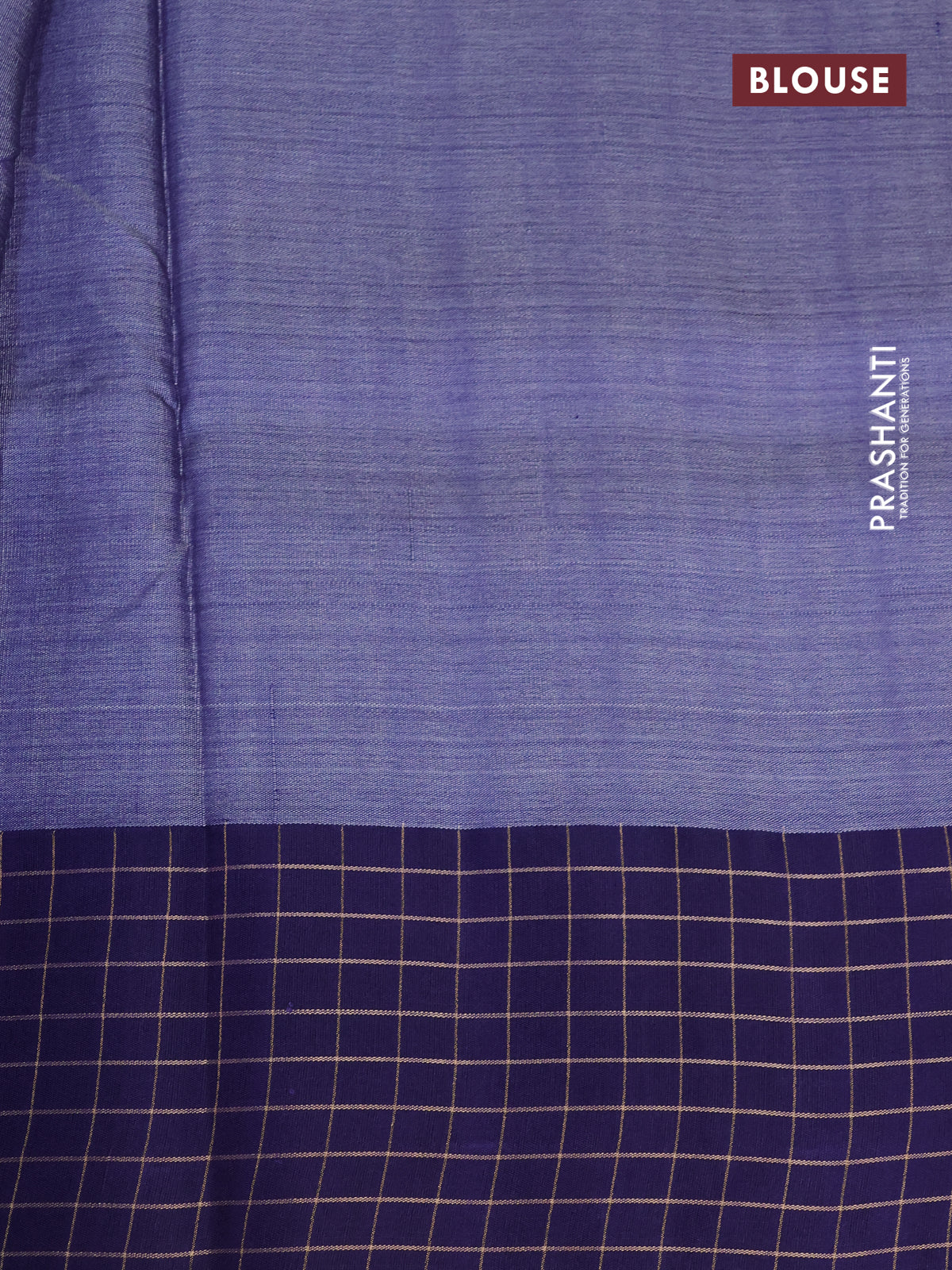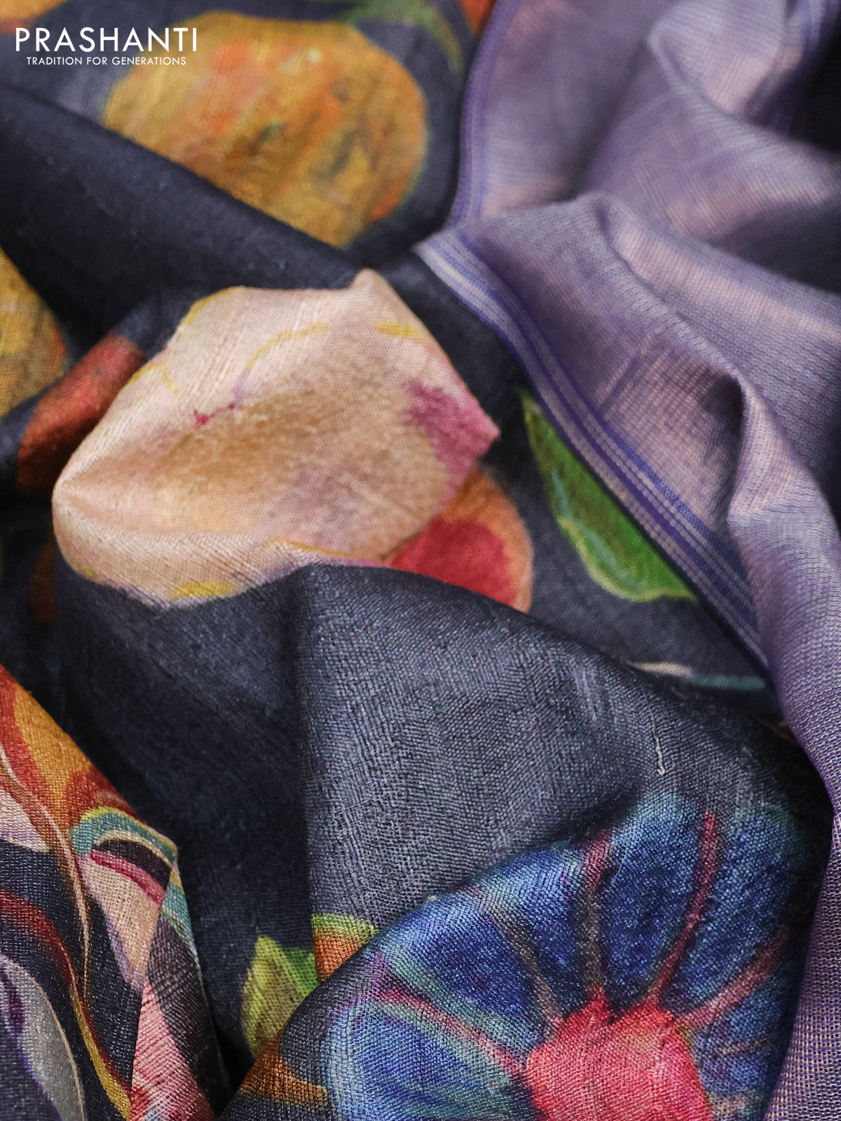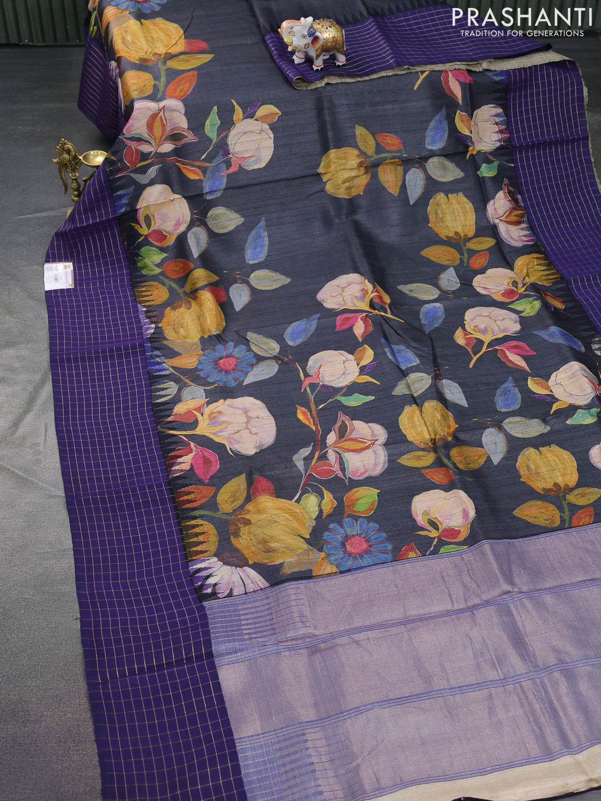 Pure tussar silk saree grey and blue with floral digital prints and temple design zari checked border