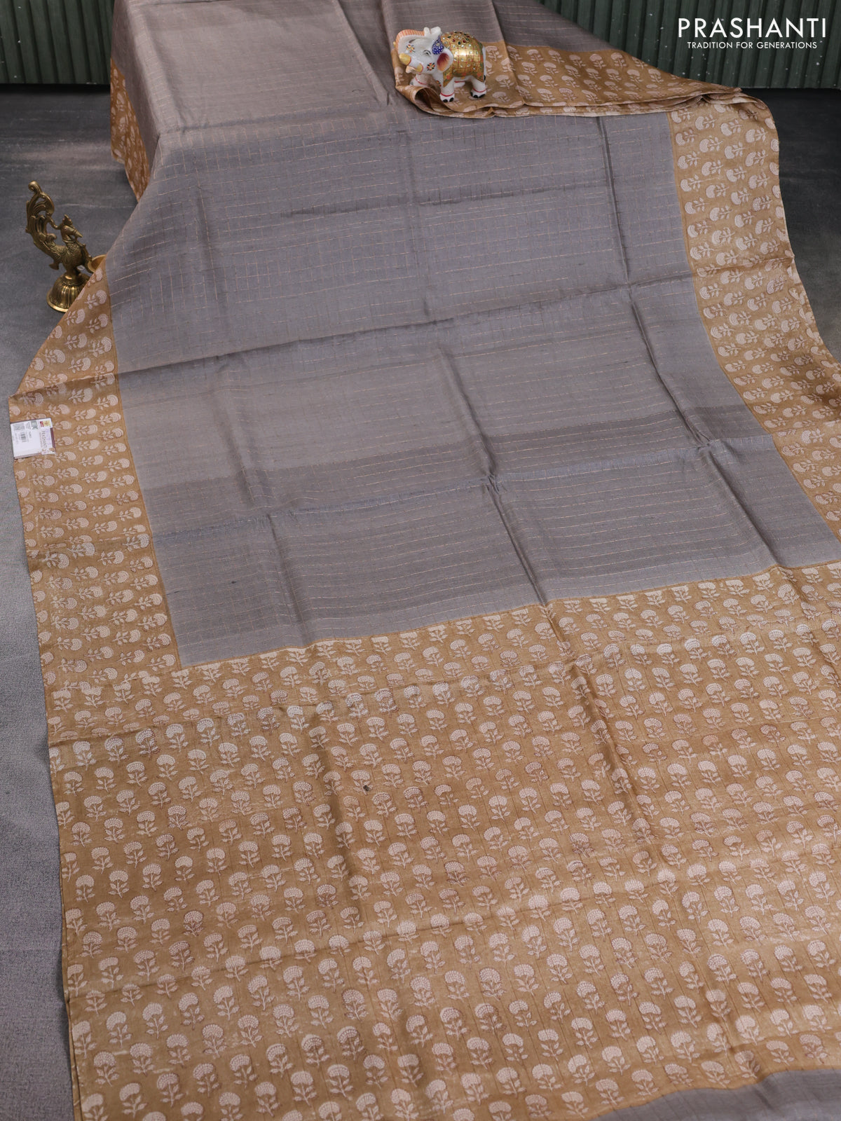 Pure tussar silk saree grey and sandal with allover zari checked pattern and floral printed border