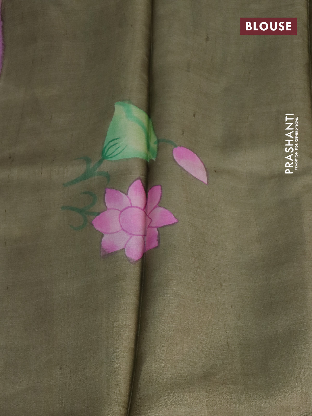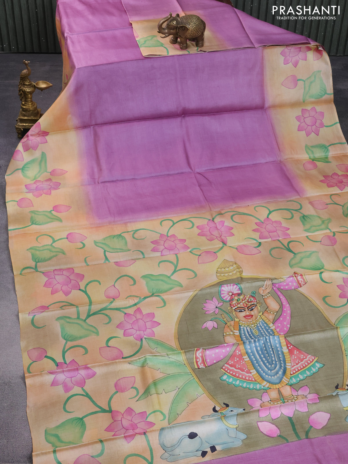 Pure tussar silk saree lavender and sandal elaichi green with plain body and pichwai hand painted pallu & border