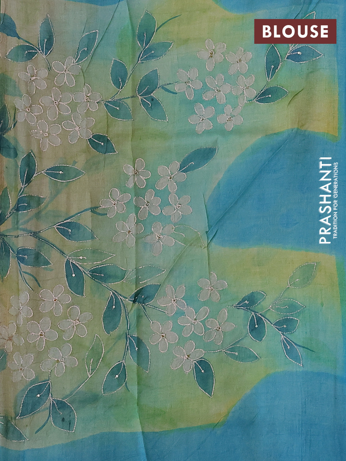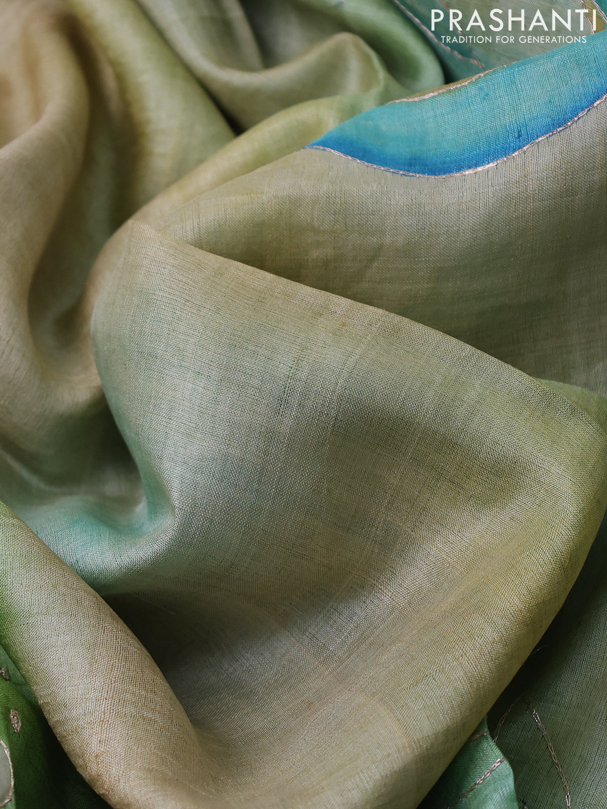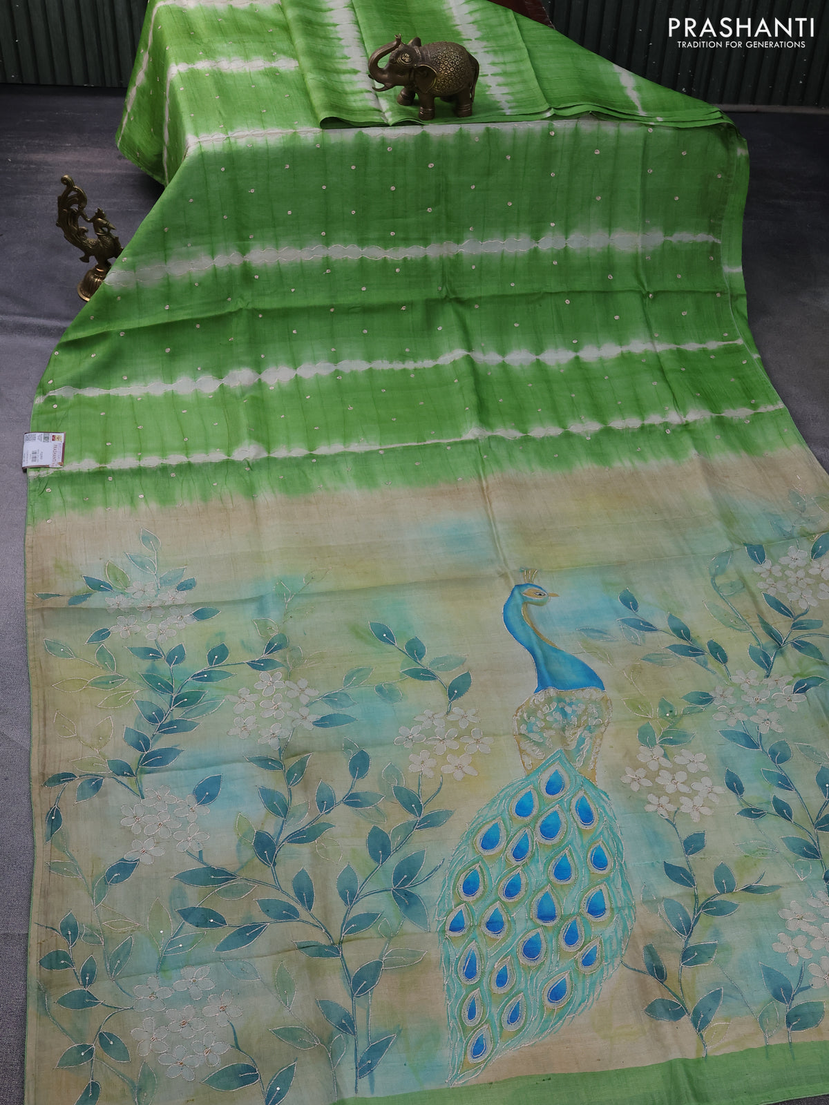Pure tussar silk saree light green and beige with tie & dye prints & pita work and embroidery pallu