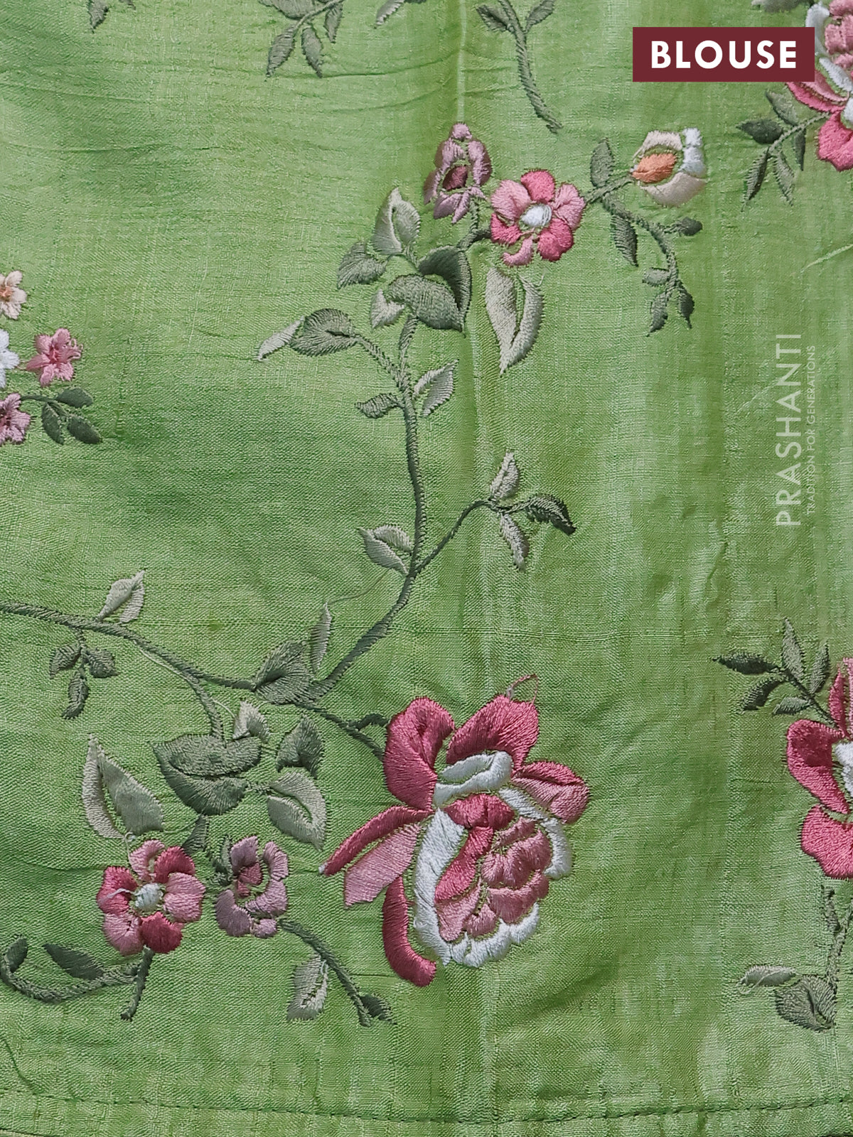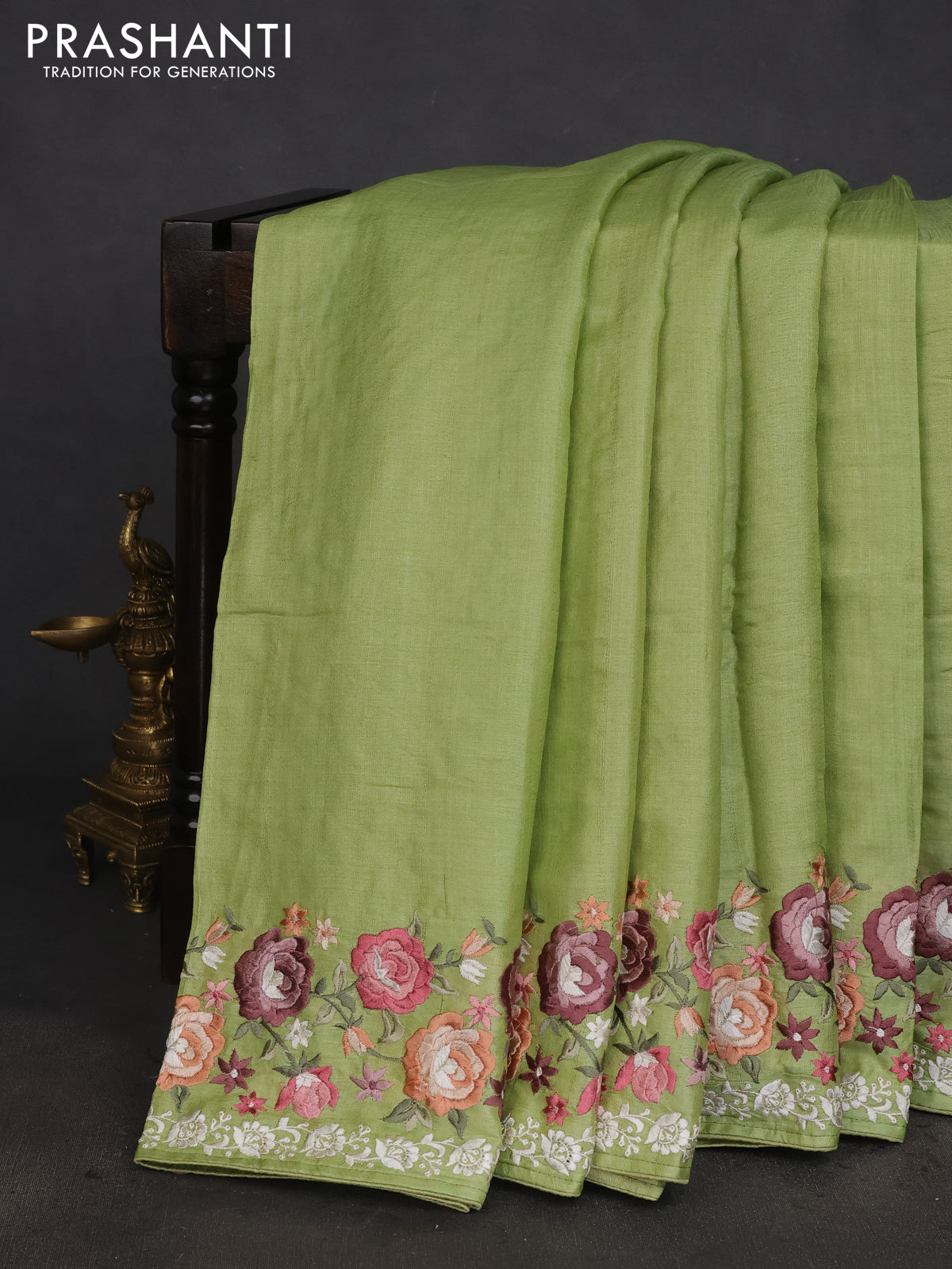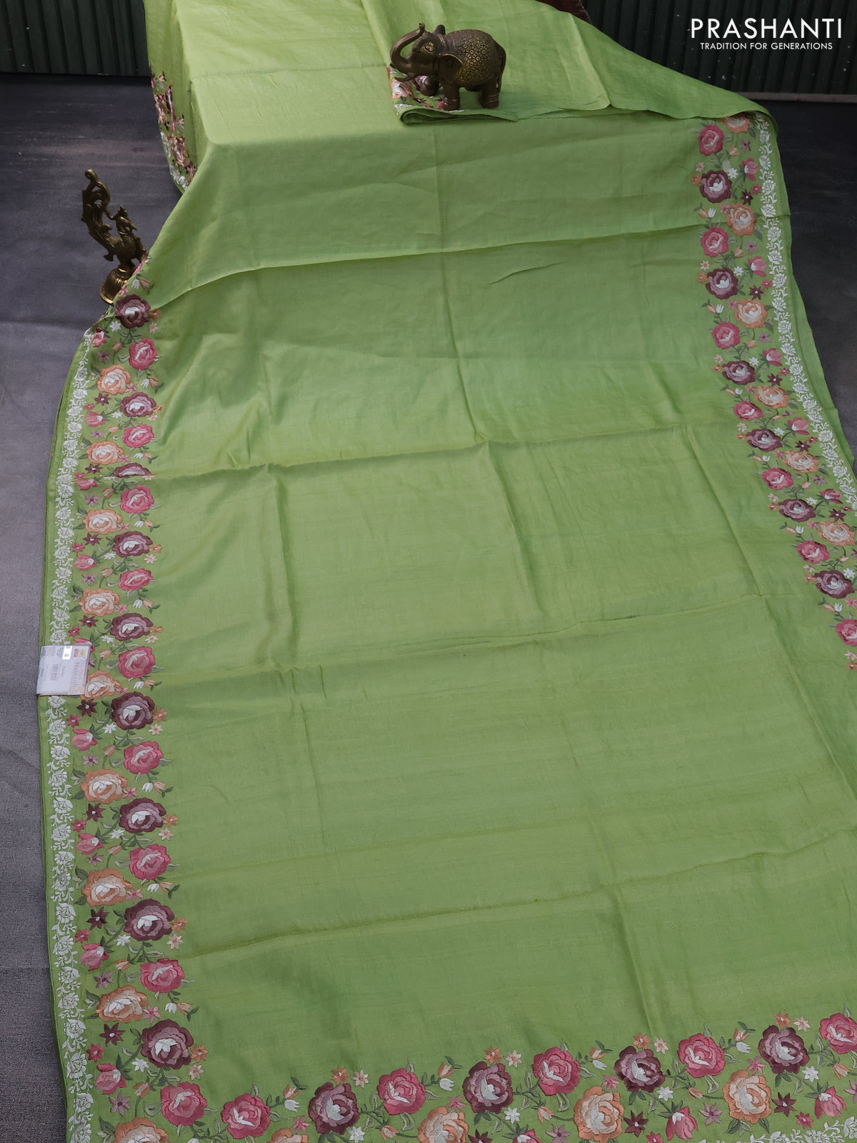 Pure tussar silk saree light green with plain body and floral design embroidery work border