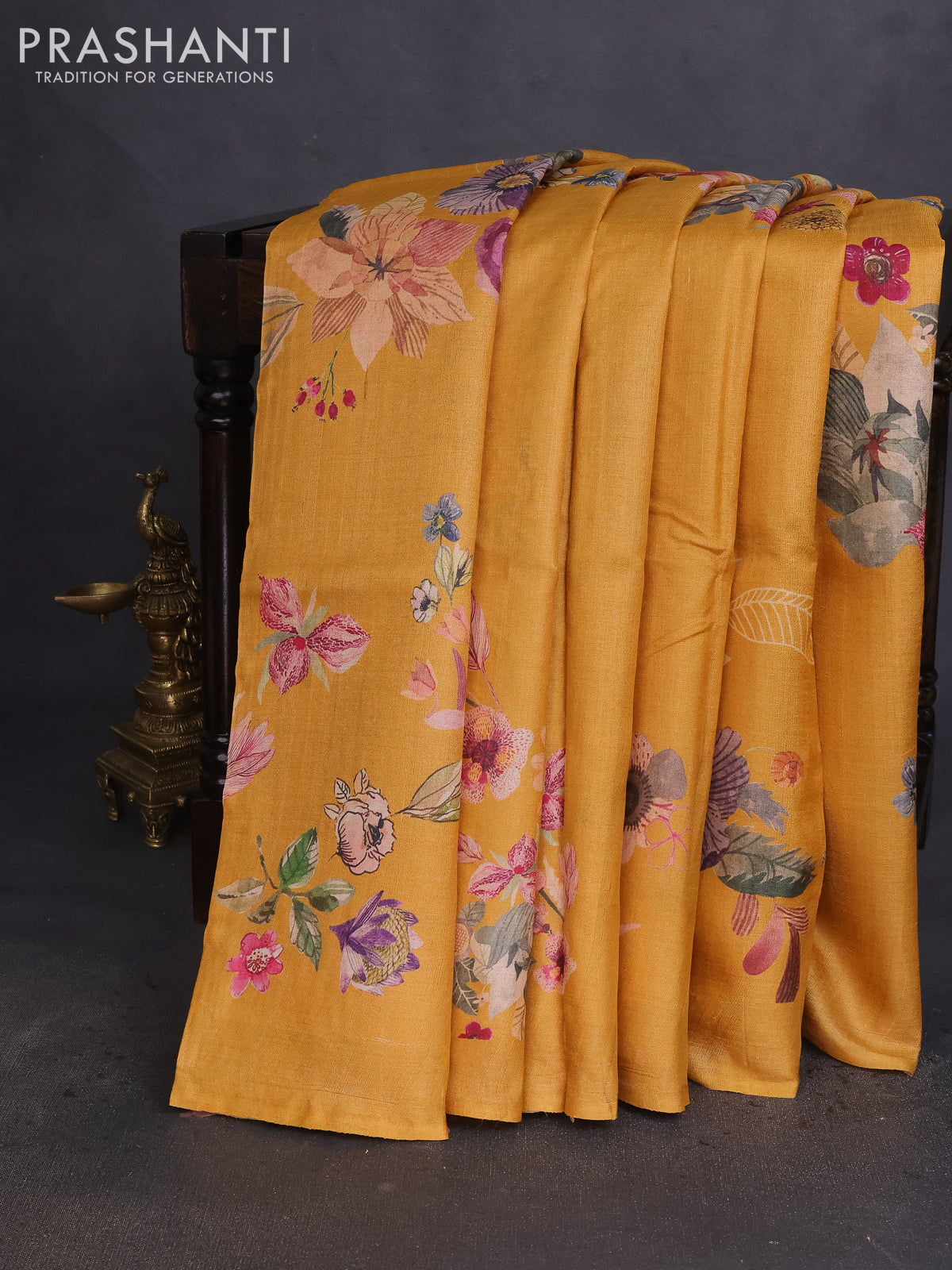 Pure tussar silk saree mango yellow with floral digital prints in borderless style