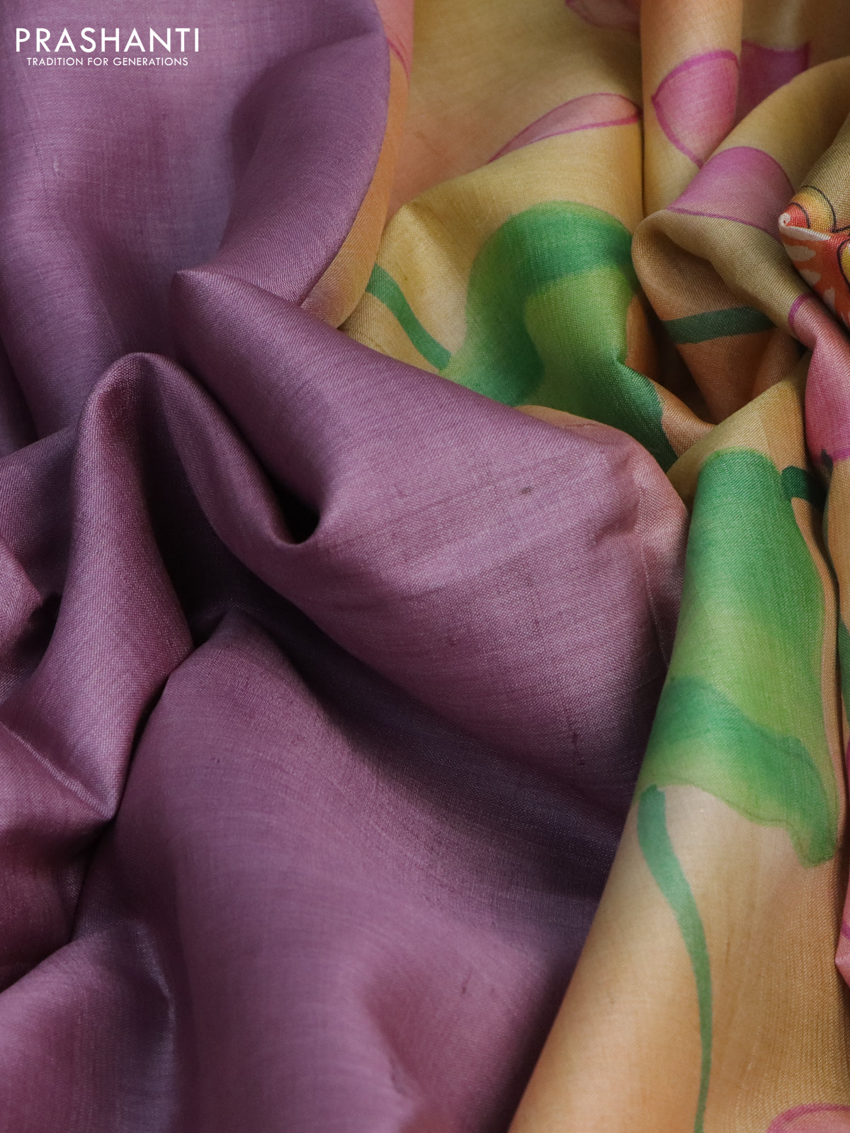 Pure tussar silk saree mauve pink and peach orange with plain body and pichwai hand painted pallu & border