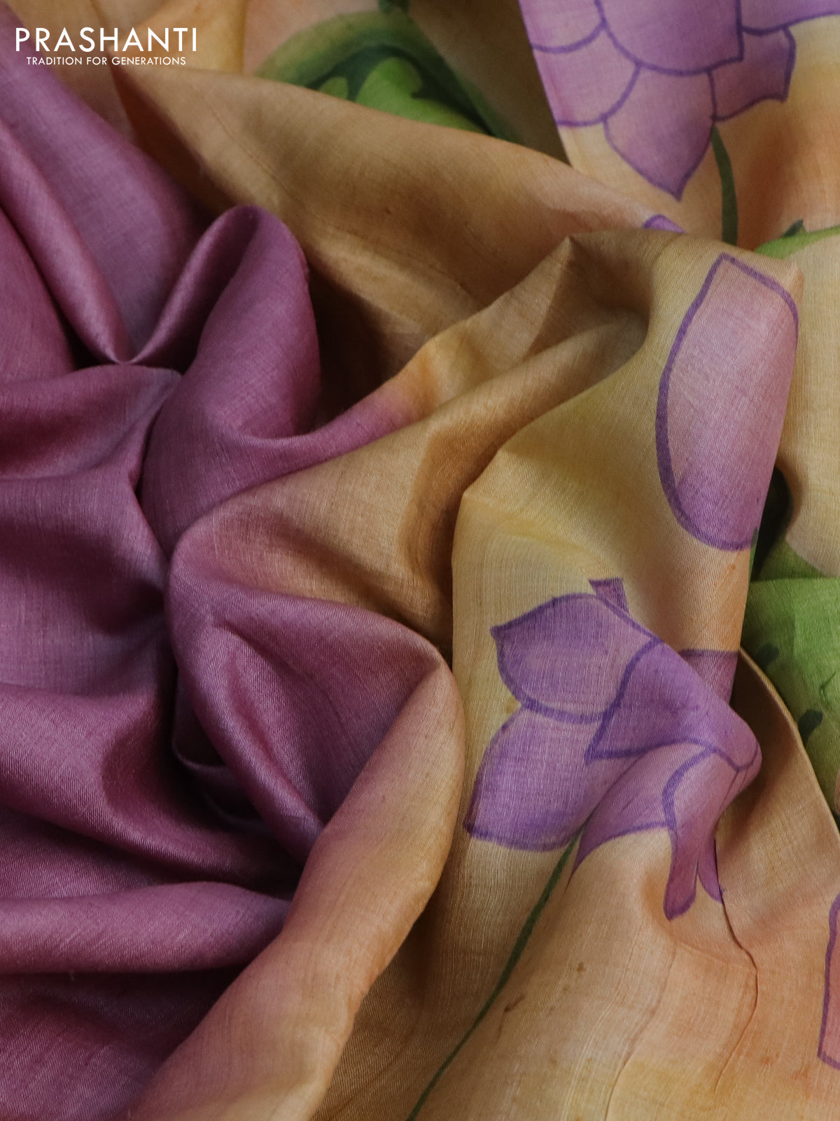 Pure tussar silk saree mauve pink and rust shade with plain body and pichwai hand painted pallu & border