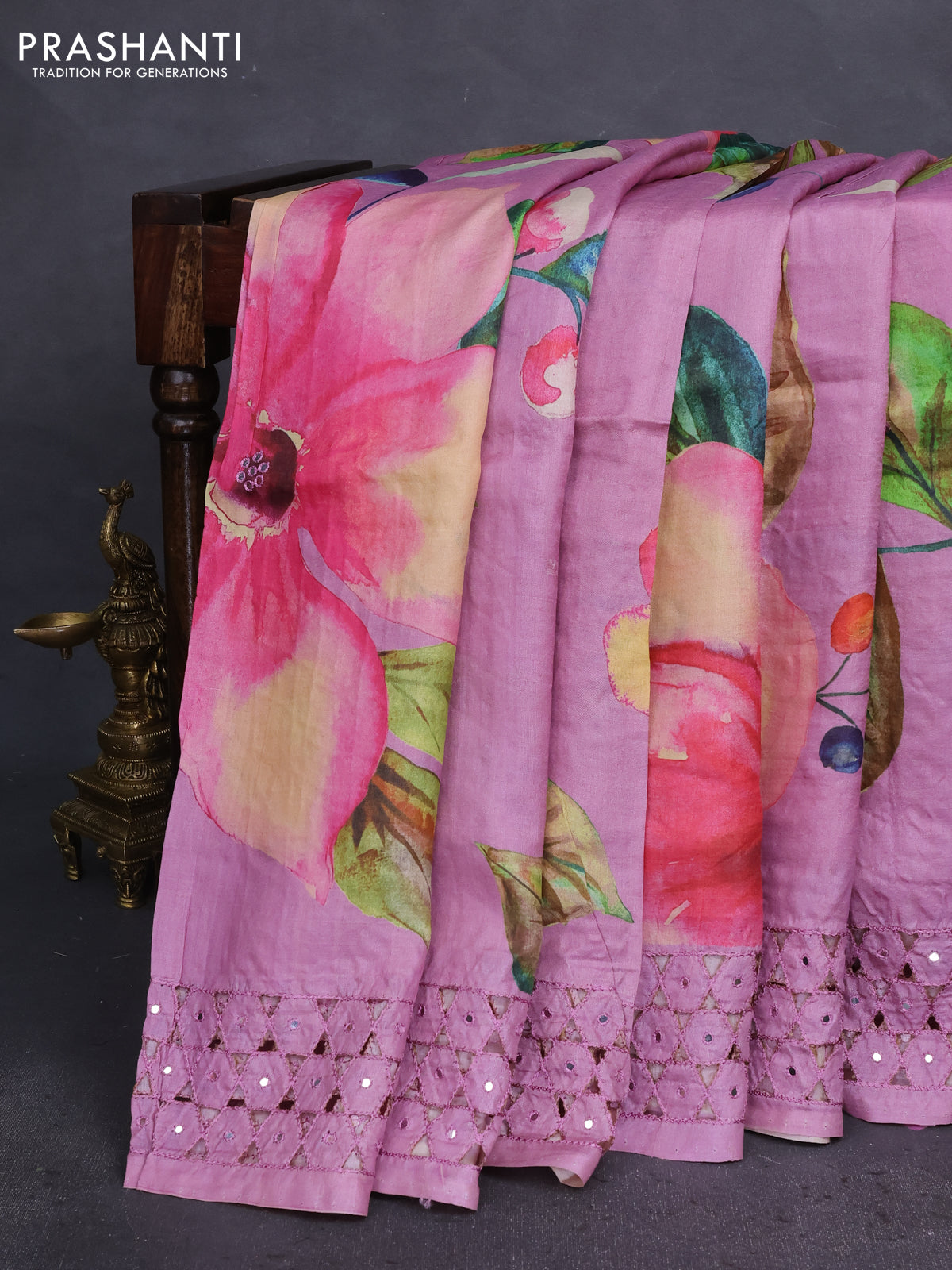 Pure tussar silk saree mauve pink with floral digital prints & mirror work and cut work border