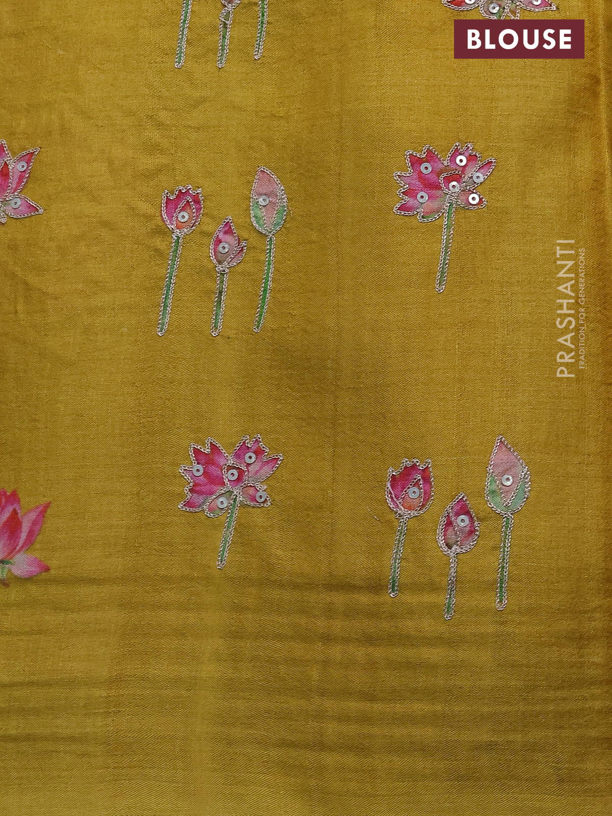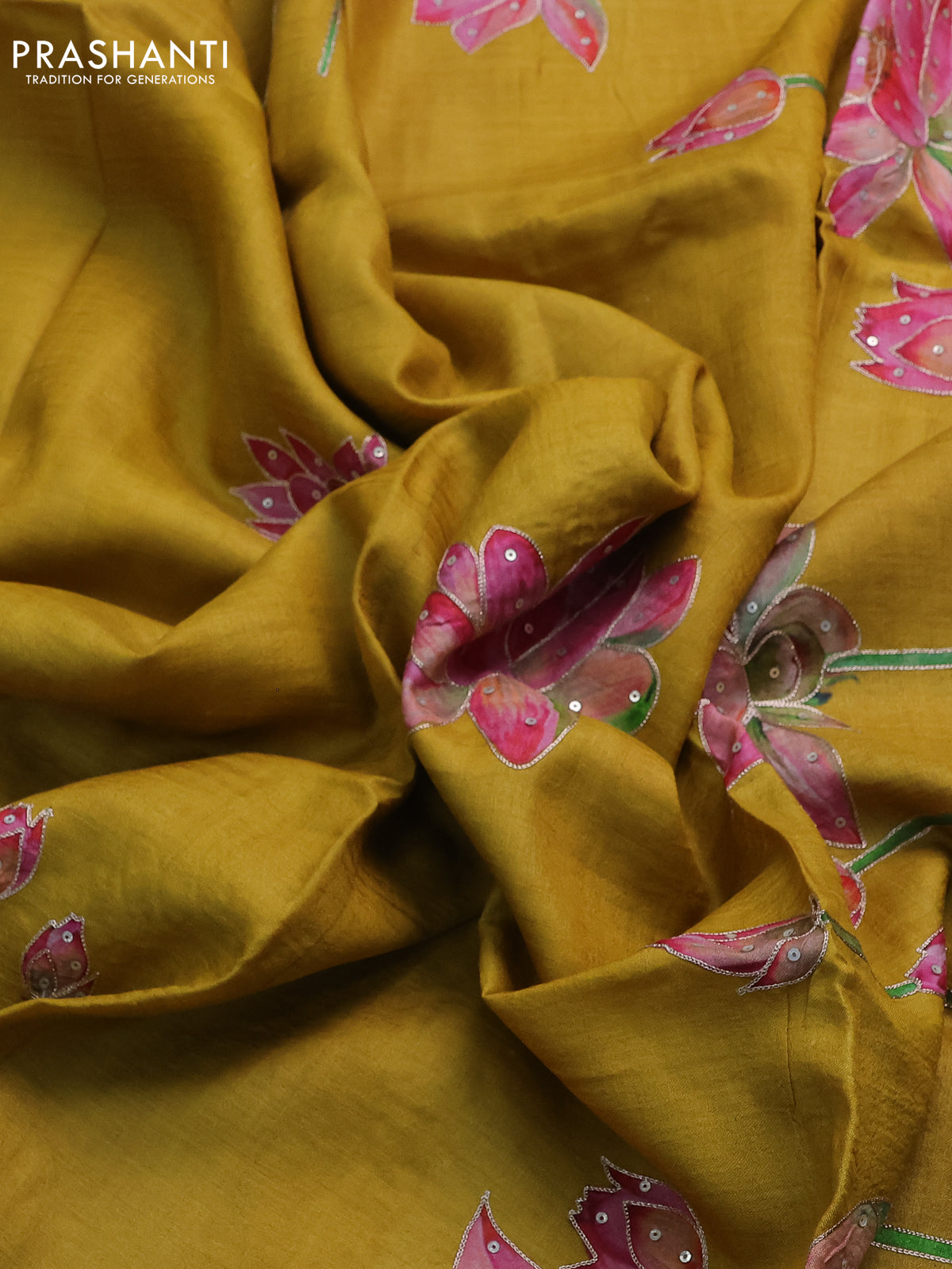 Pure tussar silk saree mustard yellow with floral prints & pita work and simple border