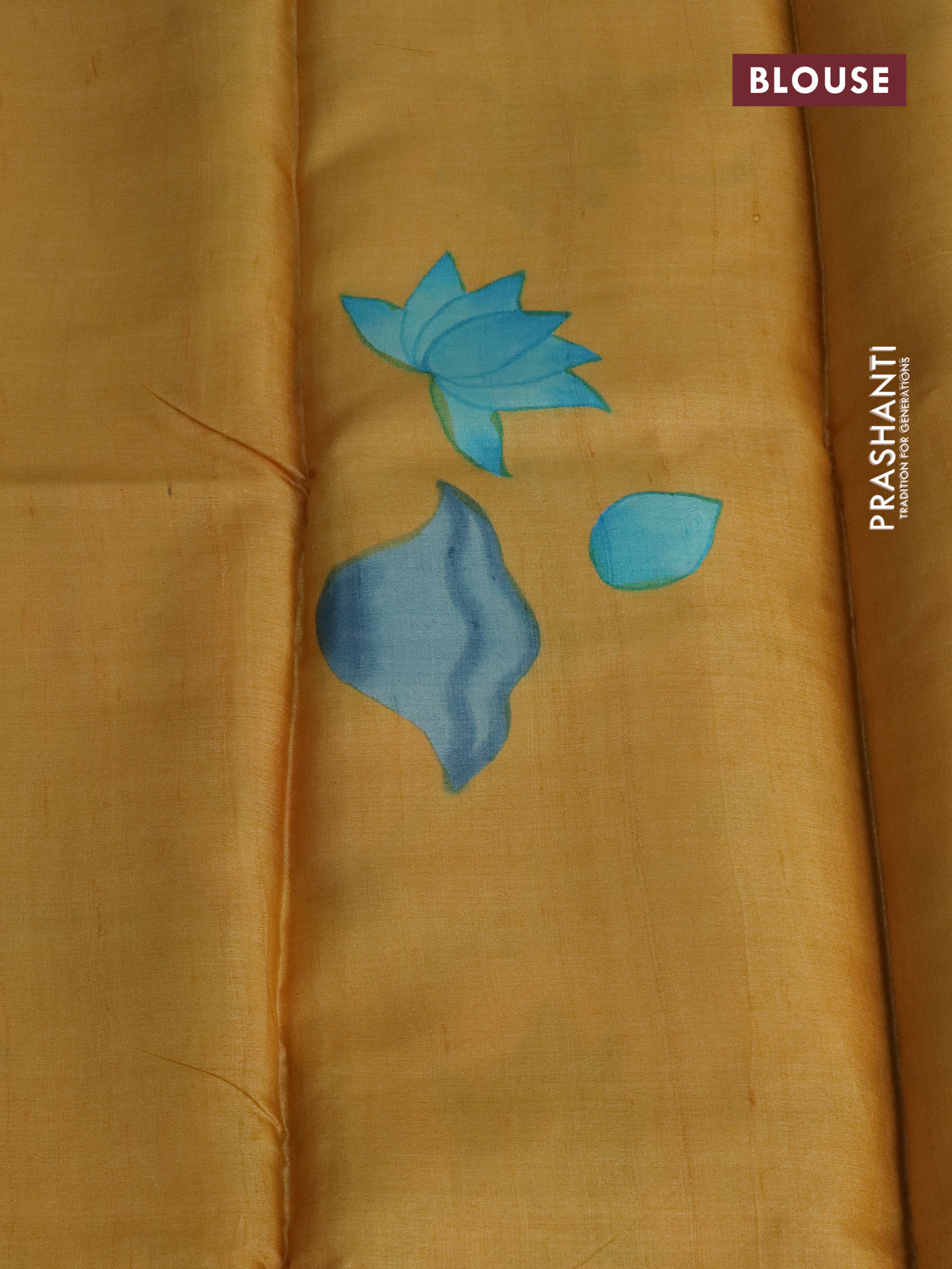 Pure tussar silk saree pastel green and mustard yellow with plain body and pichwai hand painted pallu & border
