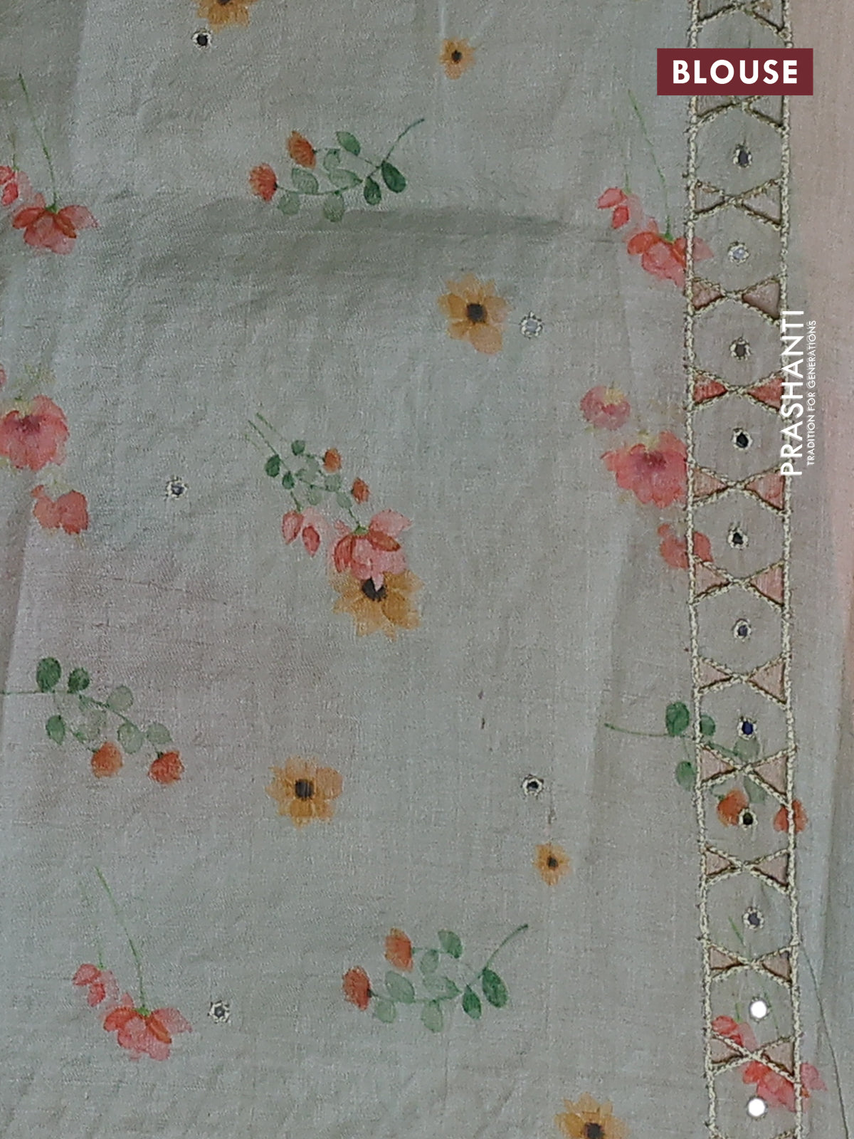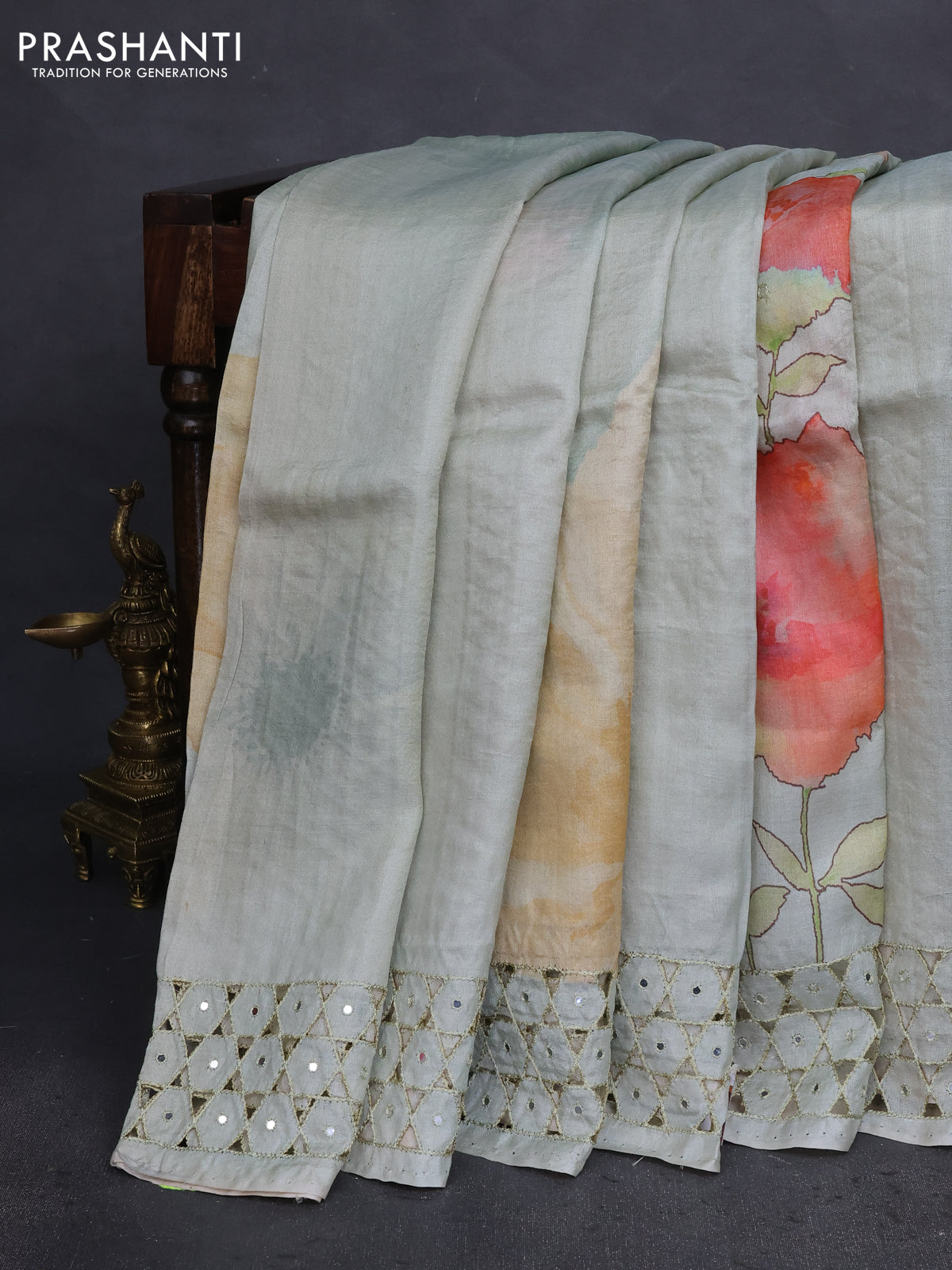 Pure tussar silk saree pastel green with floral digital prints & mirror work and cut work border