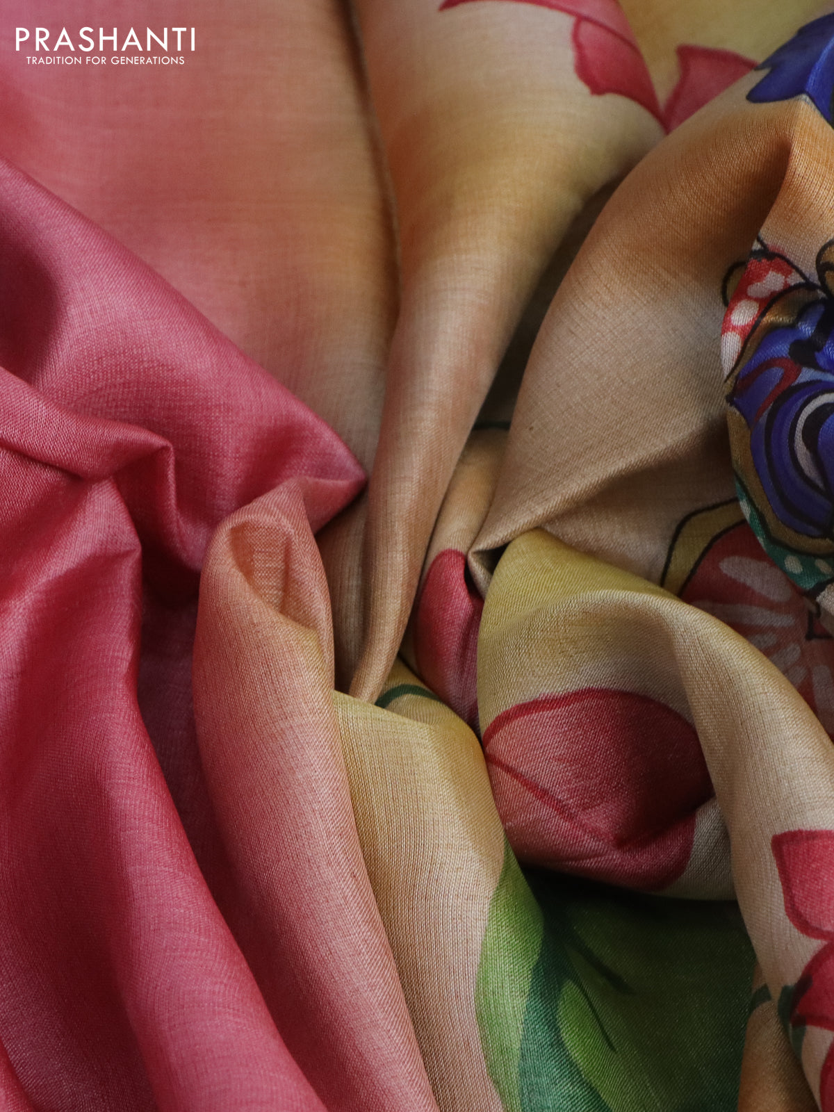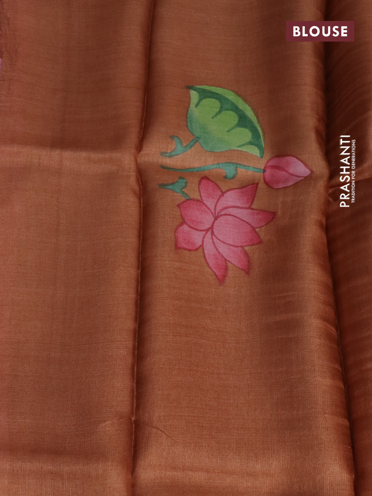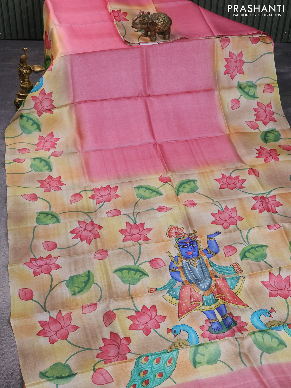 Pure tussar silk saree peach pink and rust shade with plain body and pichwai hand painted pallu & border