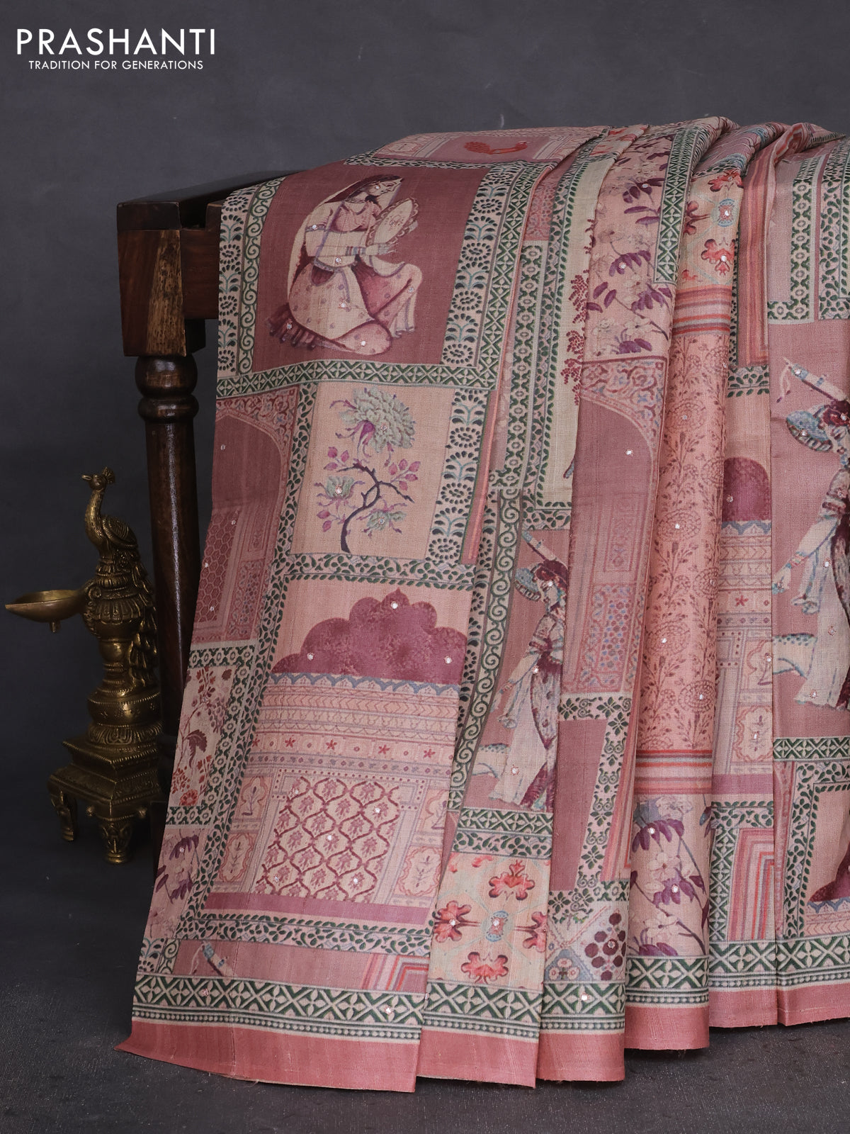 Pure tussar silk saree peach shade with allover prints & mirror work and printed border
