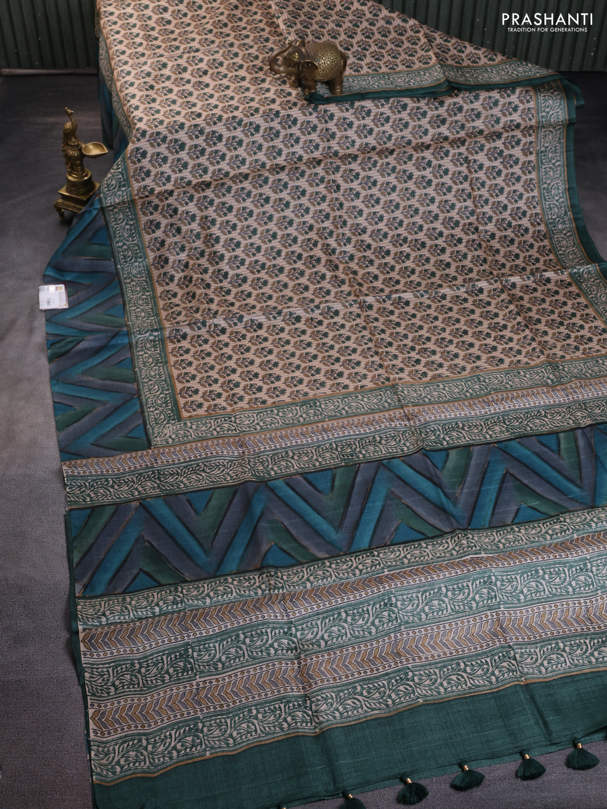 Pure tussar silk saree sandal and multi colour with floral butta prints and printed border