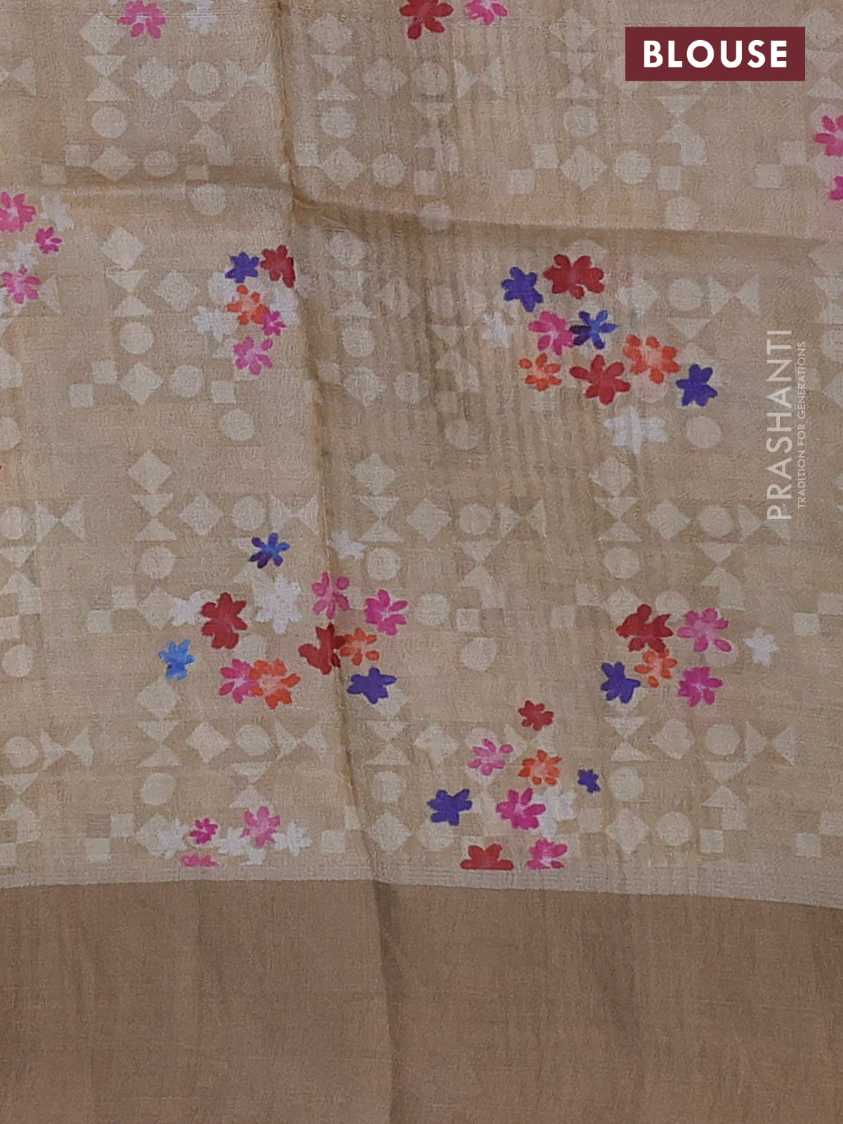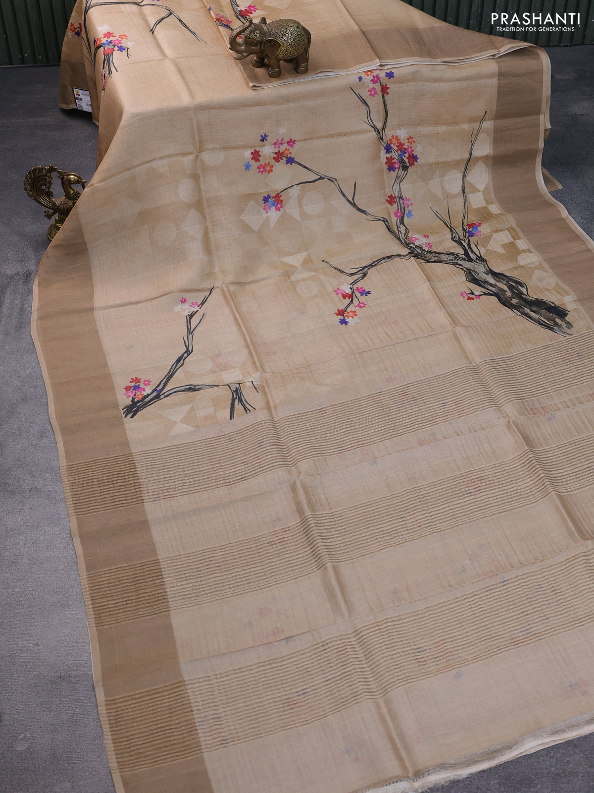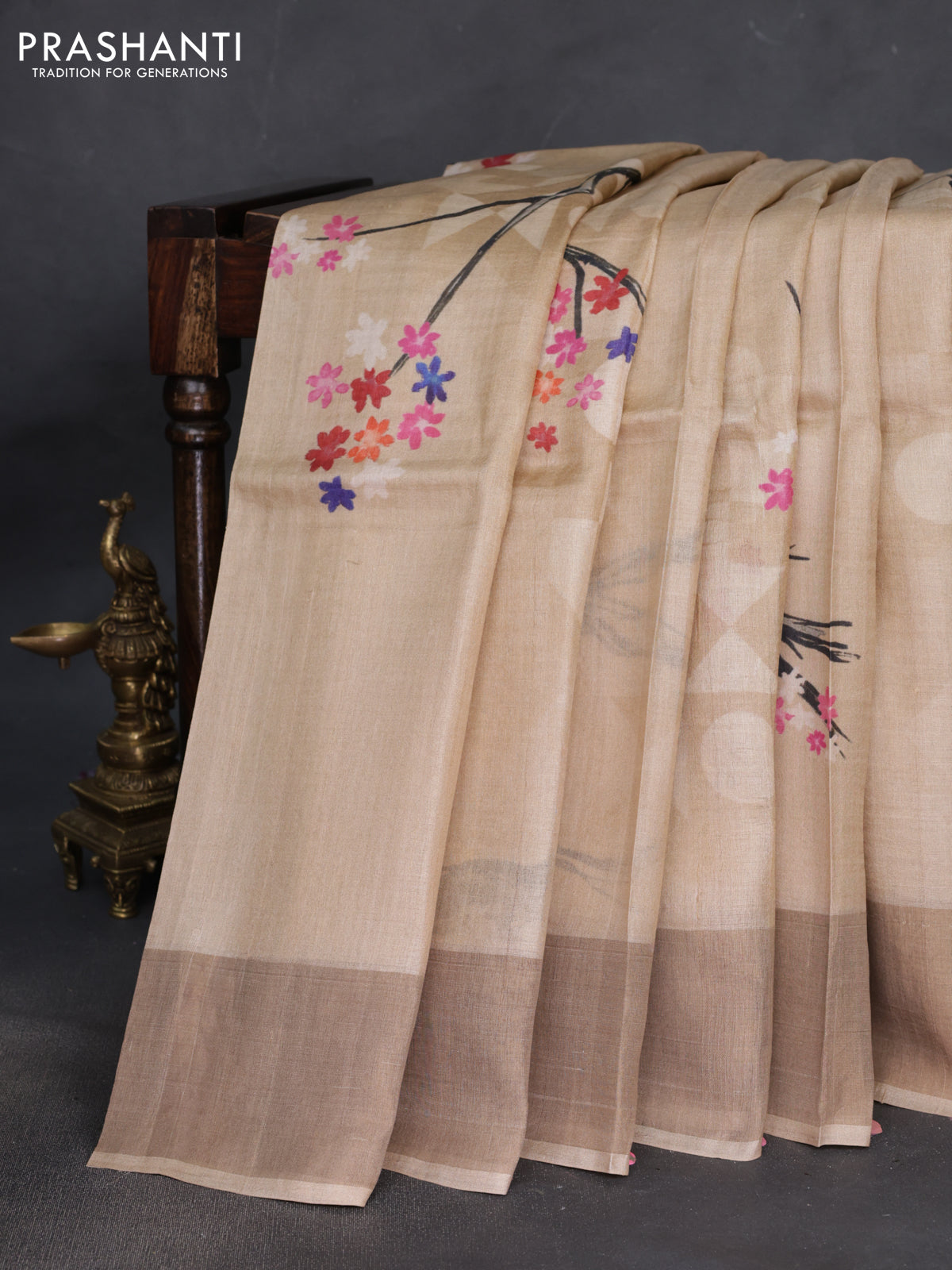Pure tussar silk saree sandal with floral digital prints and zari woven border
