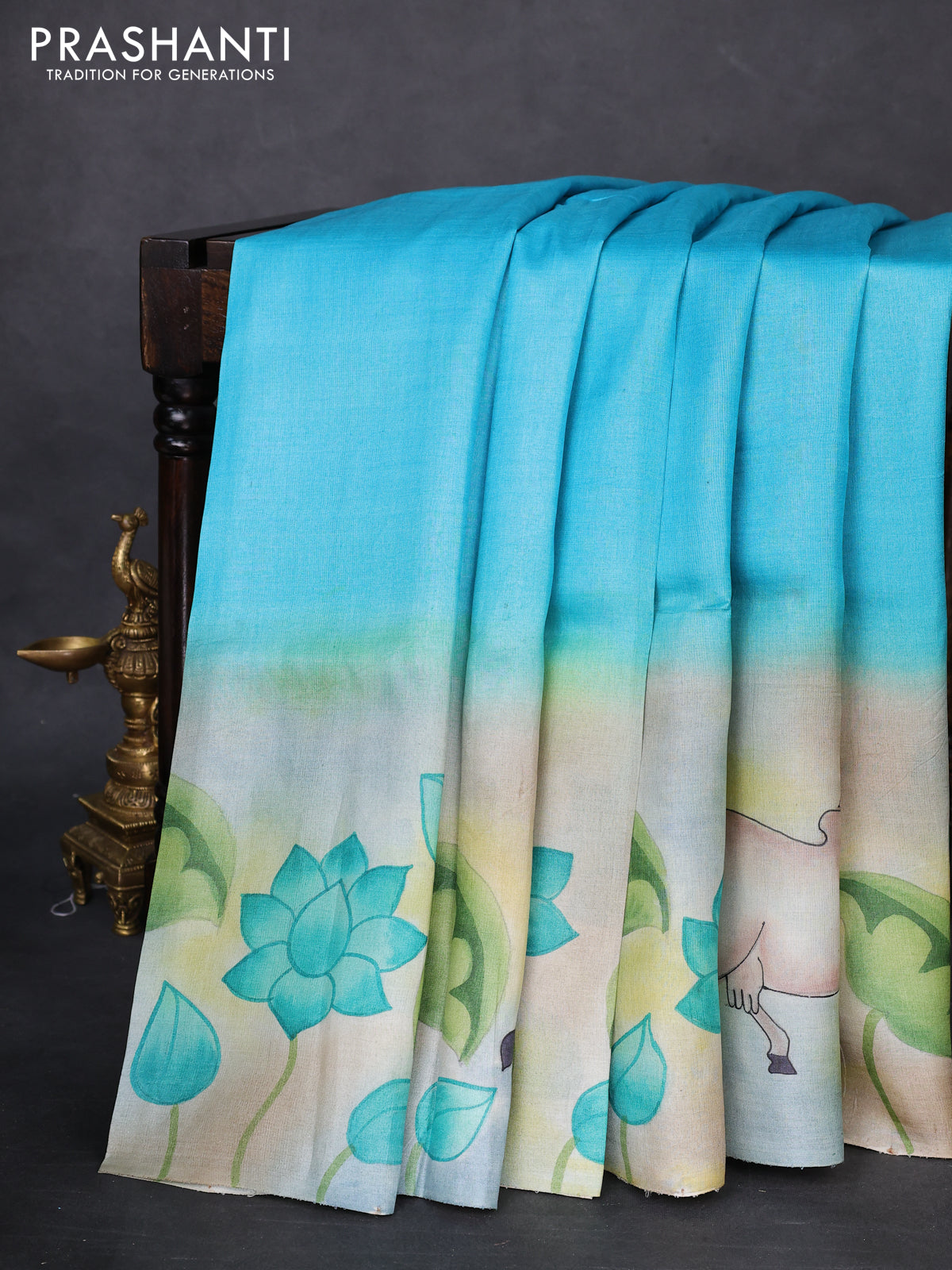 Pure tussar silk saree teal blue and bluish grey with plain body and pichwai hand painted pallu & border