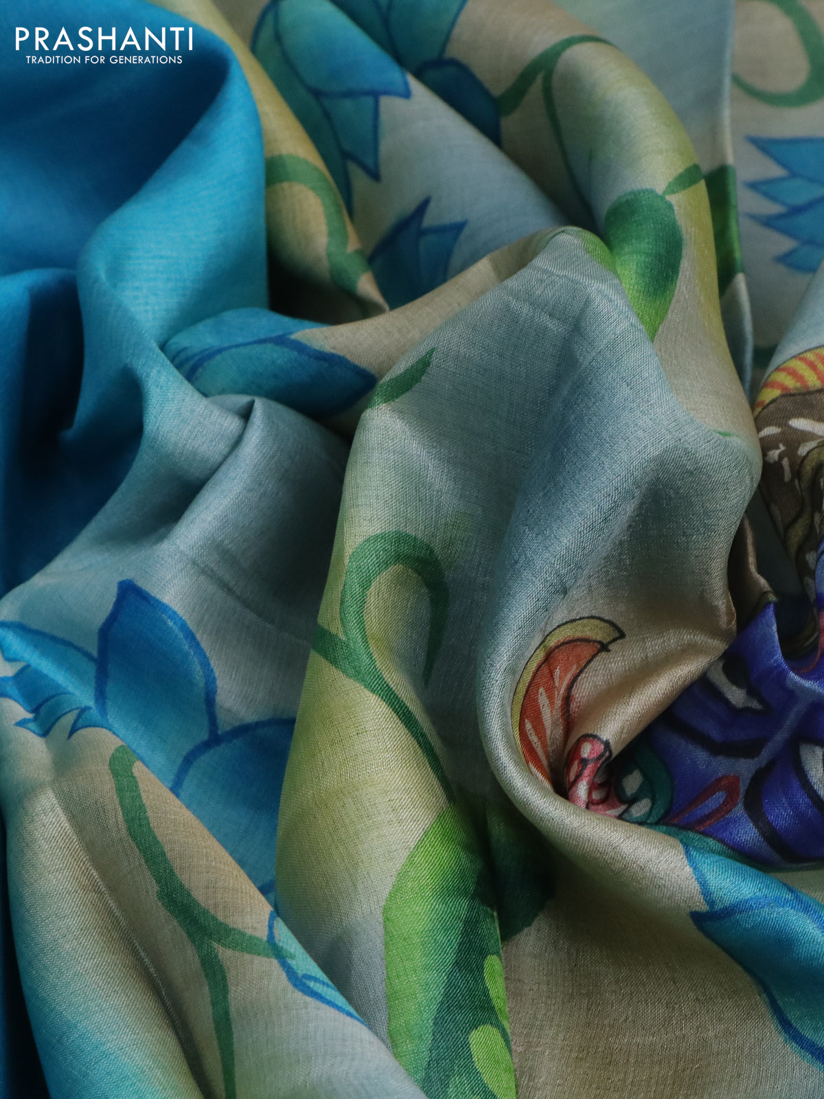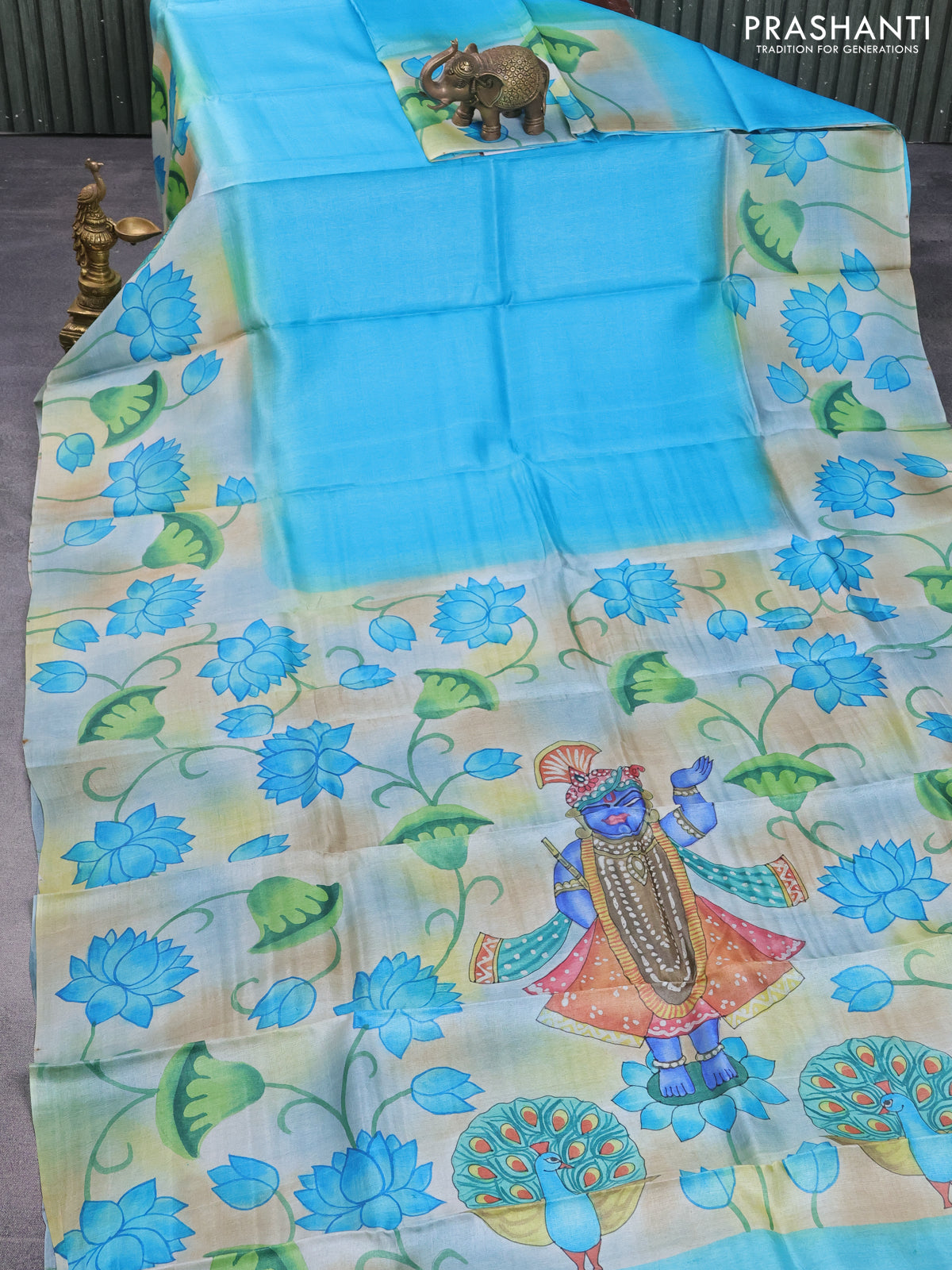 Pure tussar silk saree teal blue and bluish grey with plain body and pichwai hand painted pallu & border