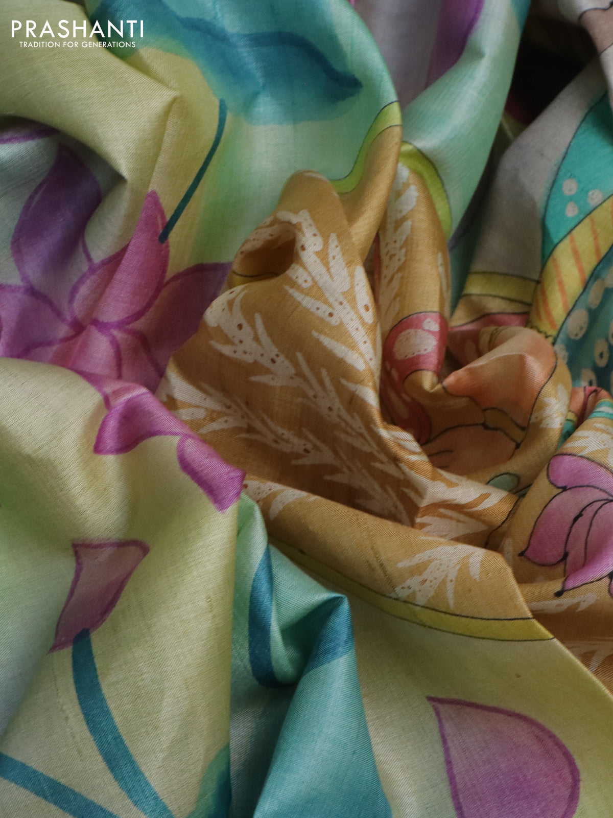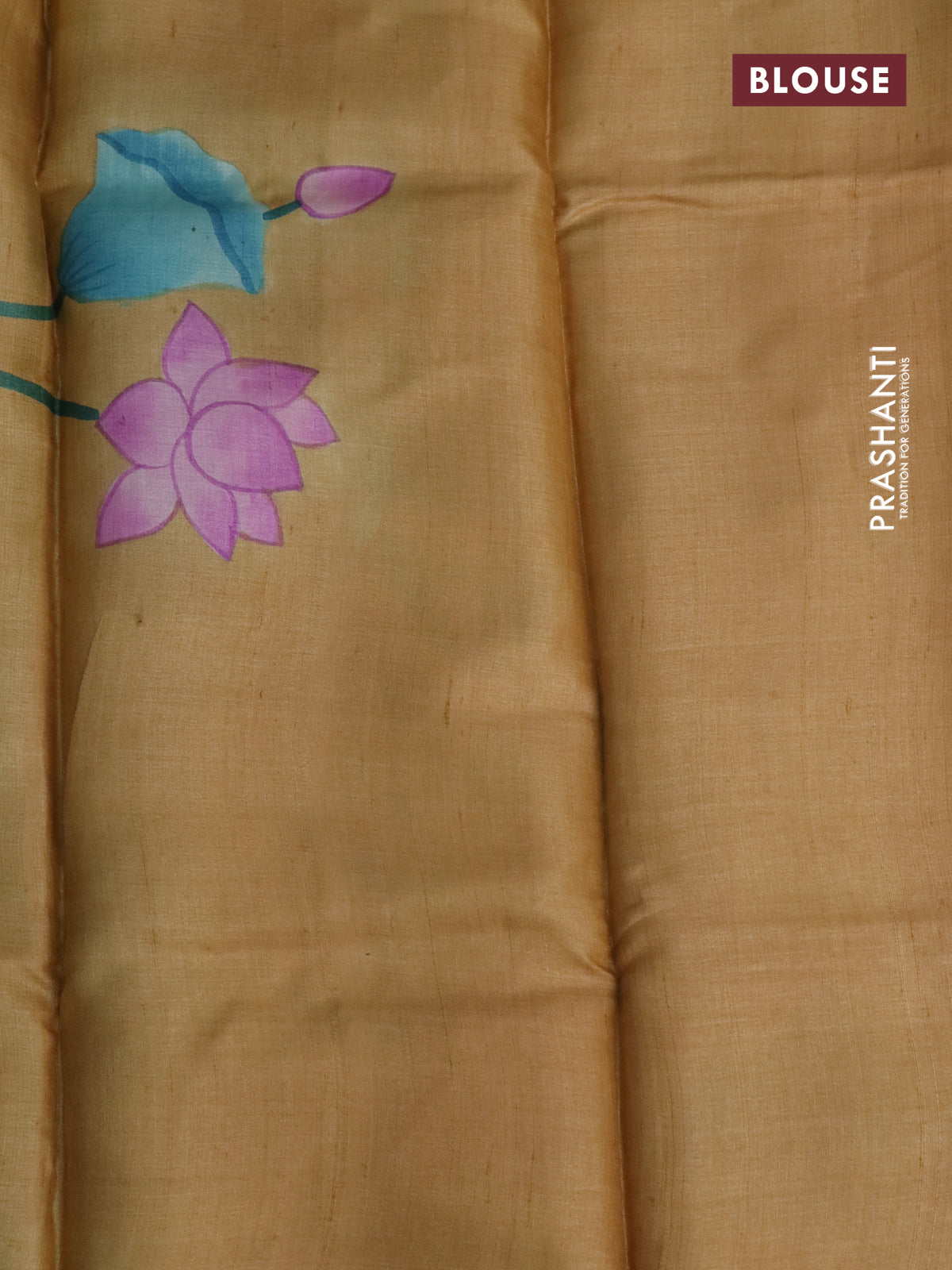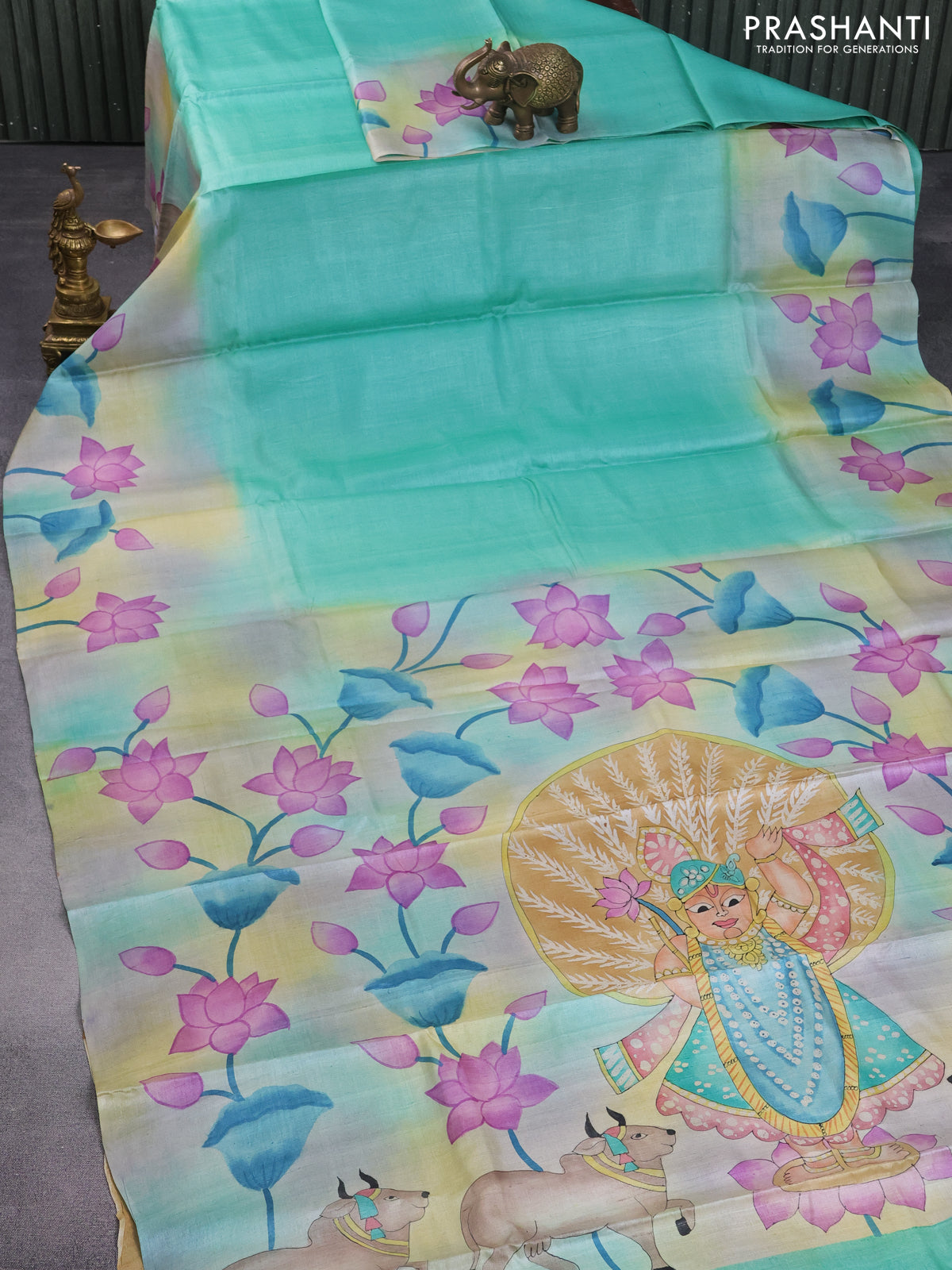 Pure tussar silk saree teal green shade and sandal with plain body and pichwai hand painted pallu & border
