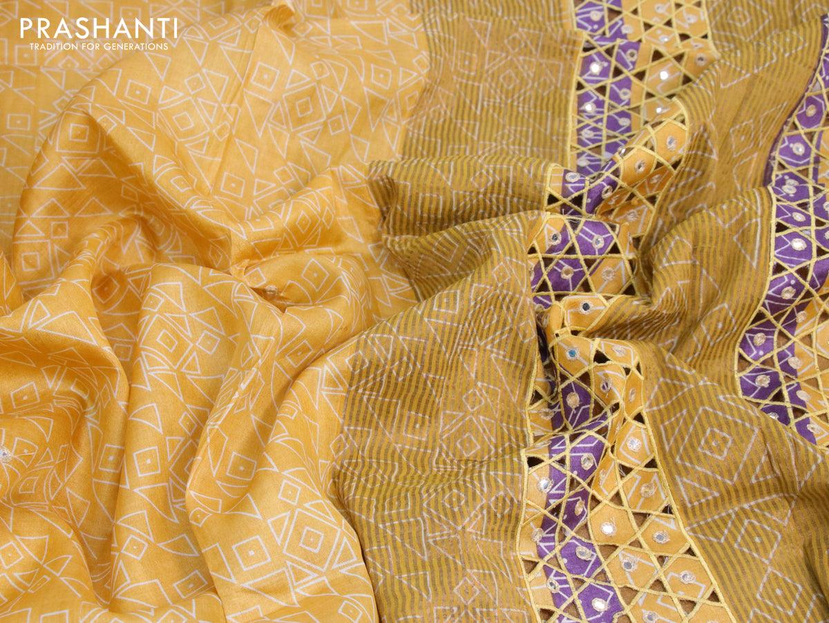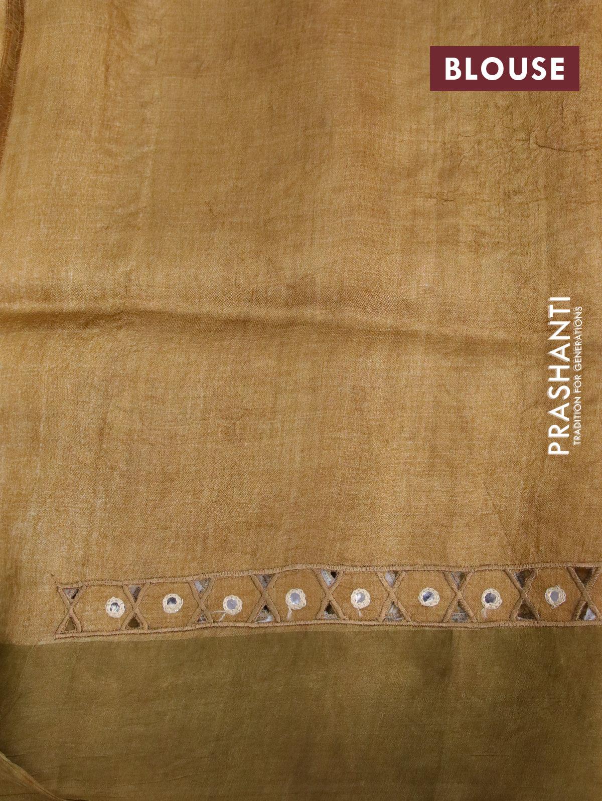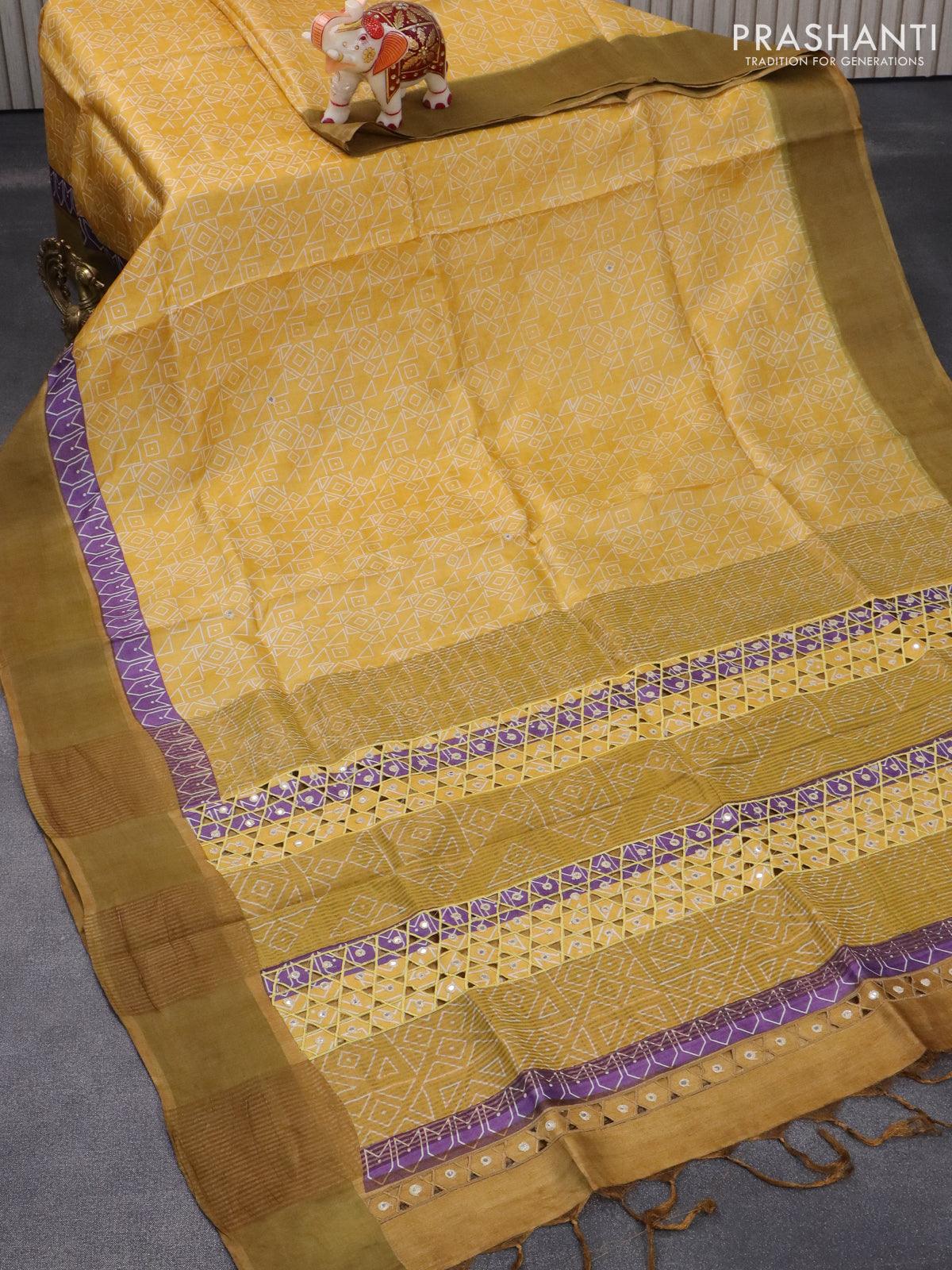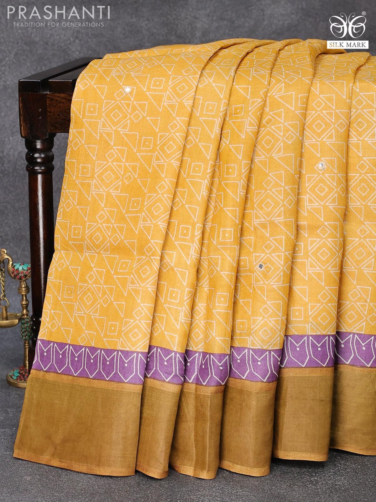 Pure tussar silk saree yellow and dark mustard with allover geometric prints & mirror work and cut work pallu