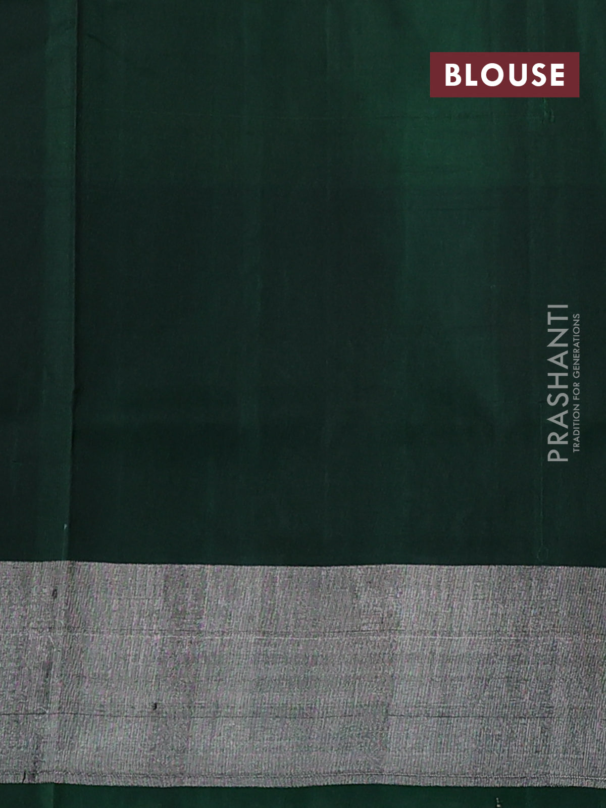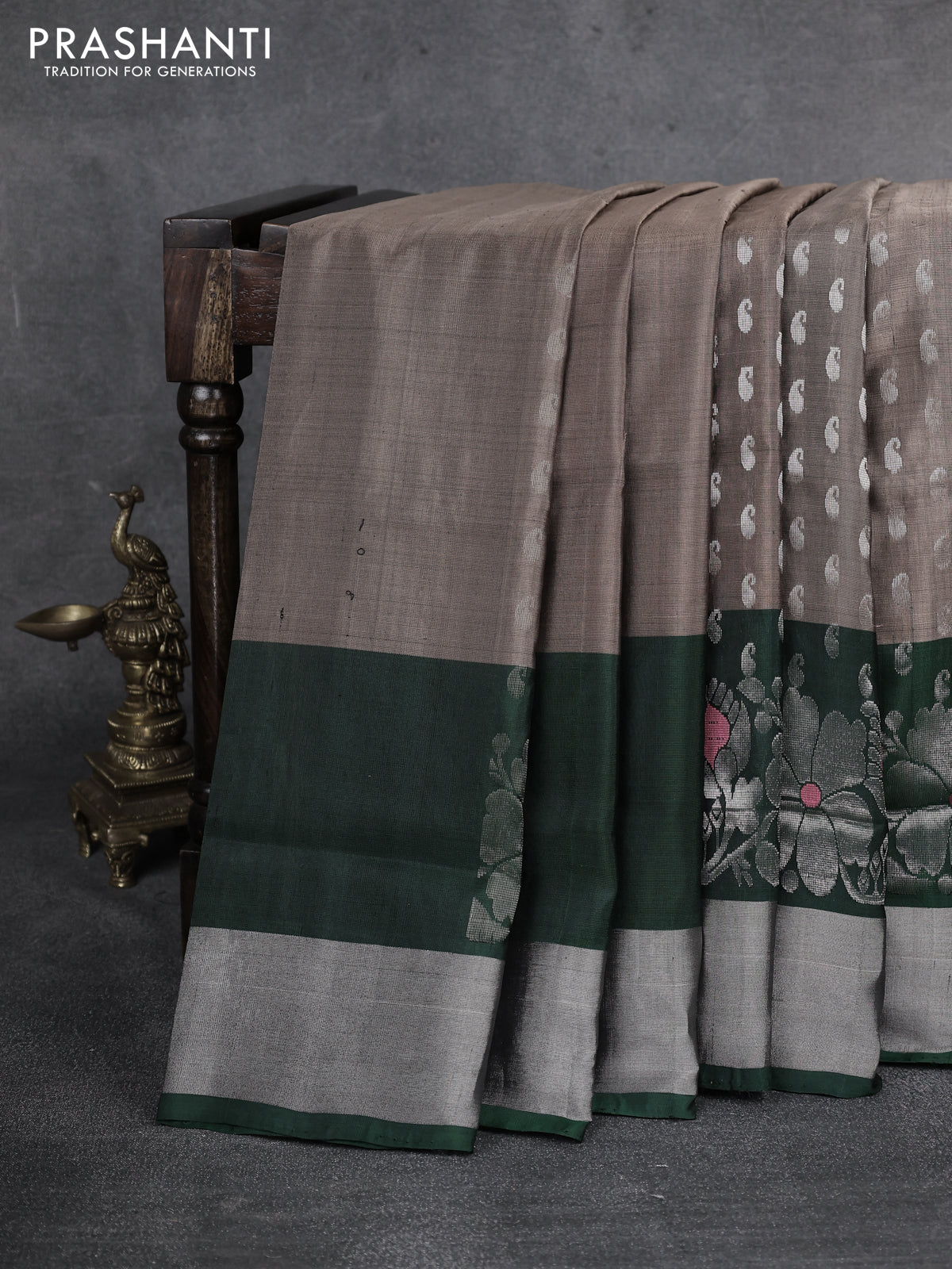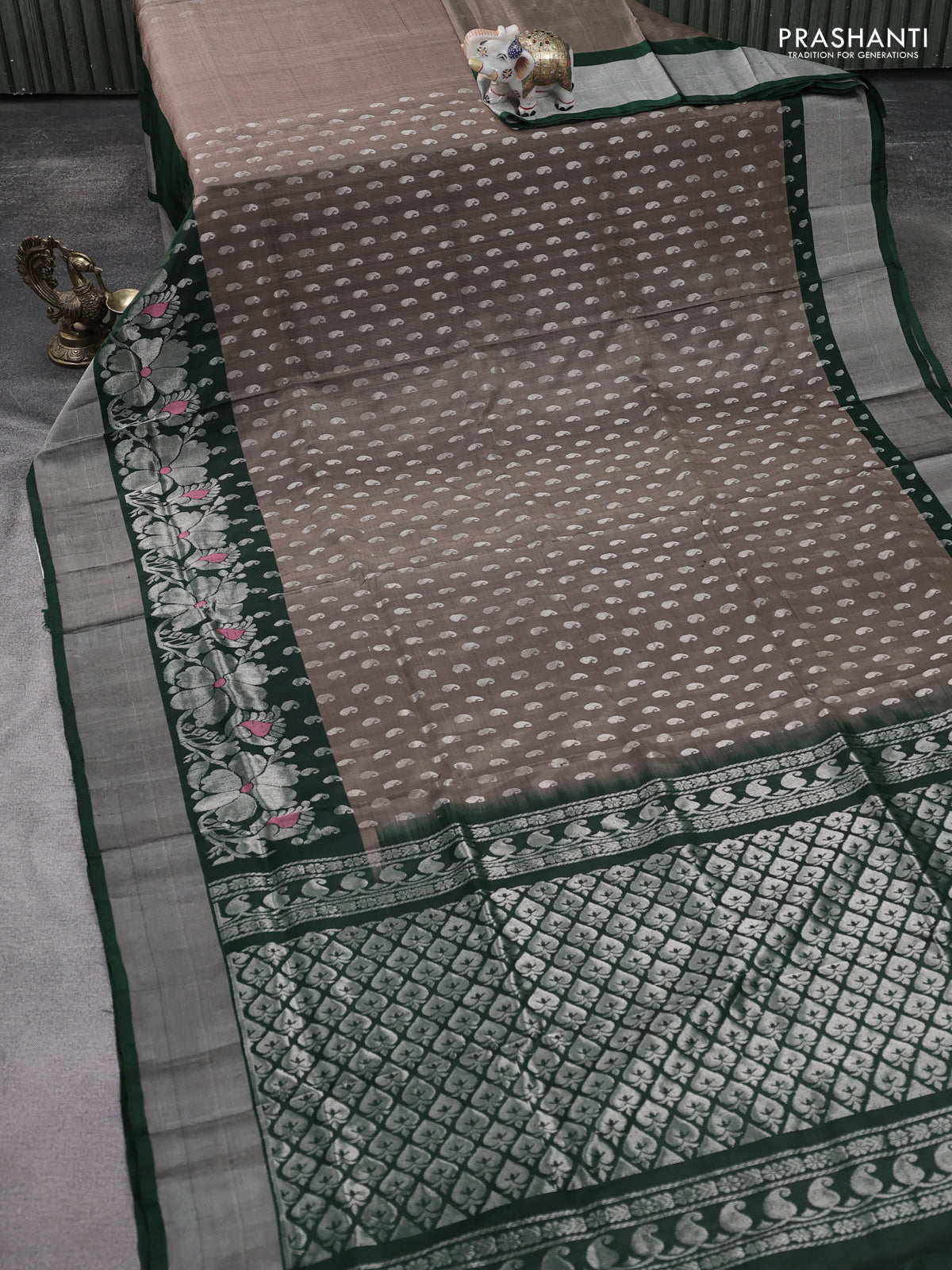 Pure uppada silk saree brown shade and green with allover silver zari woven paisley buttas and rich silver zari woven border