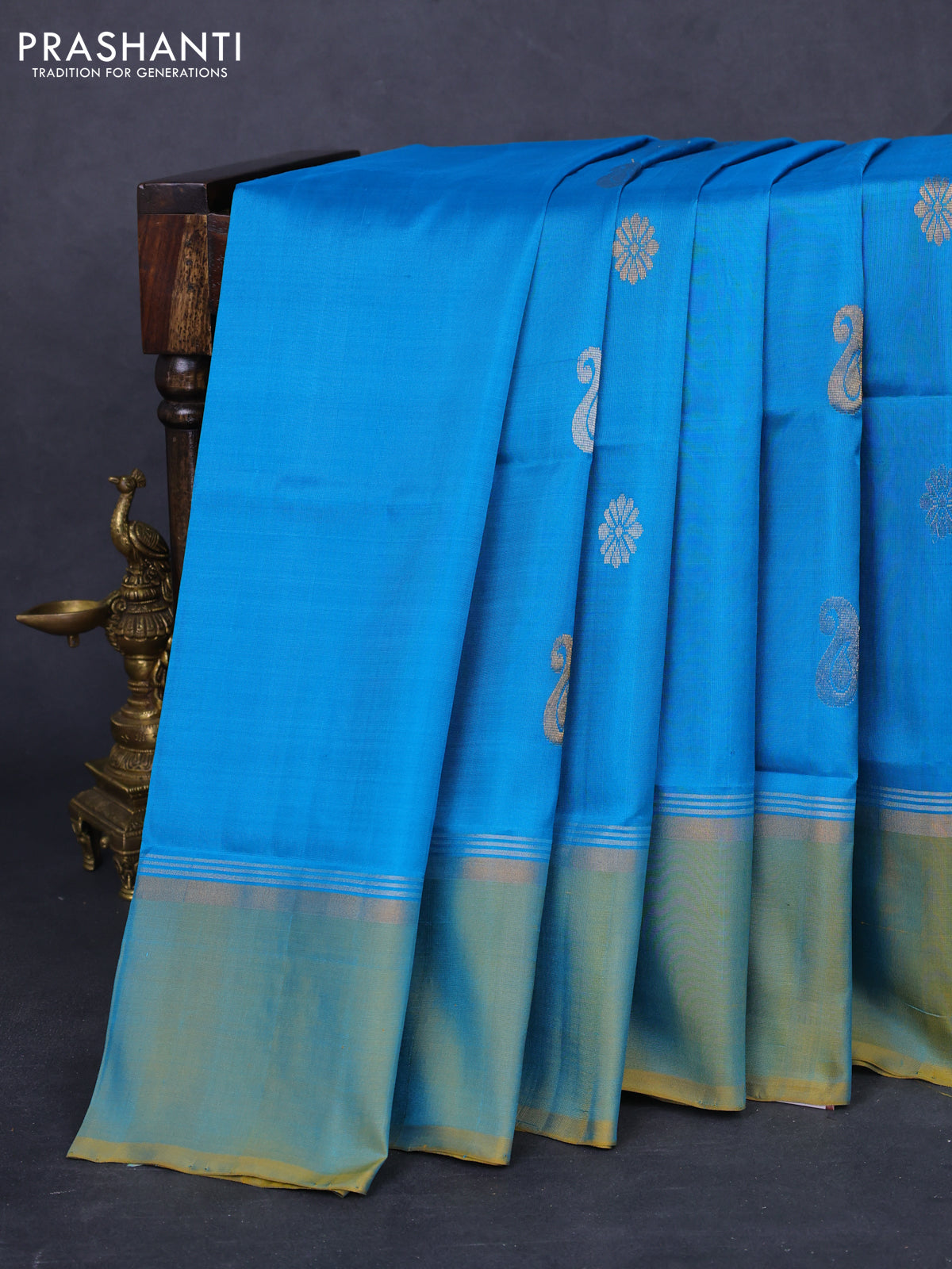 Pure uppada silk saree cs blue and yellow with silver & gold zari woven buttas and zari woven simple border