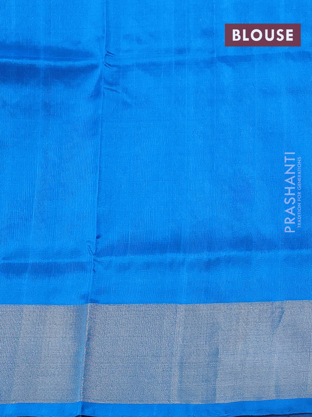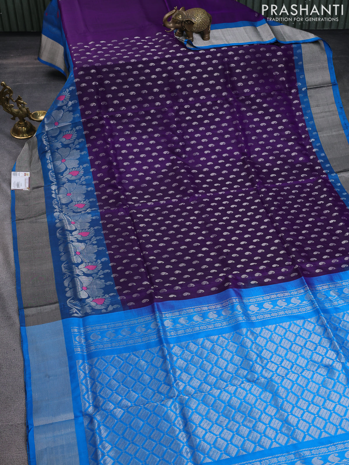 Pure uppada silk saree deep violet and cs blue with allover silver woven paisley buttas and long floral design silver zari woven border