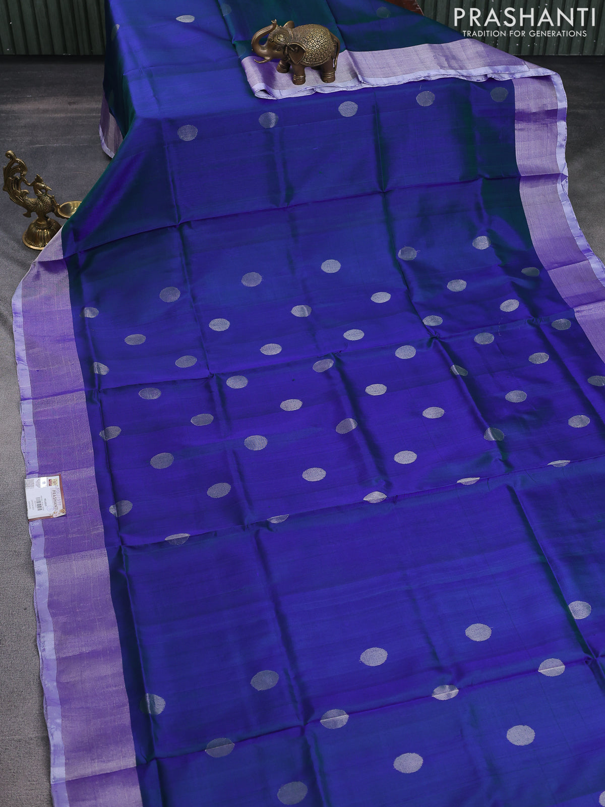 Pure uppada silk saree dual shade of bluish green with silver zari woven coin buttas and silver zari woven border