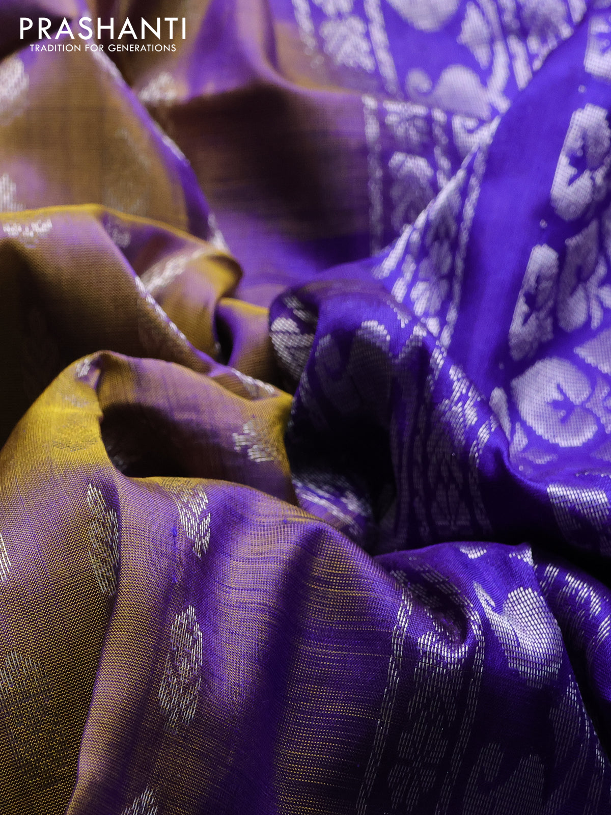 Pure uppada silk saree dual shade of mustard and blue with allover silver zari woven buttas and long silver zari woven border