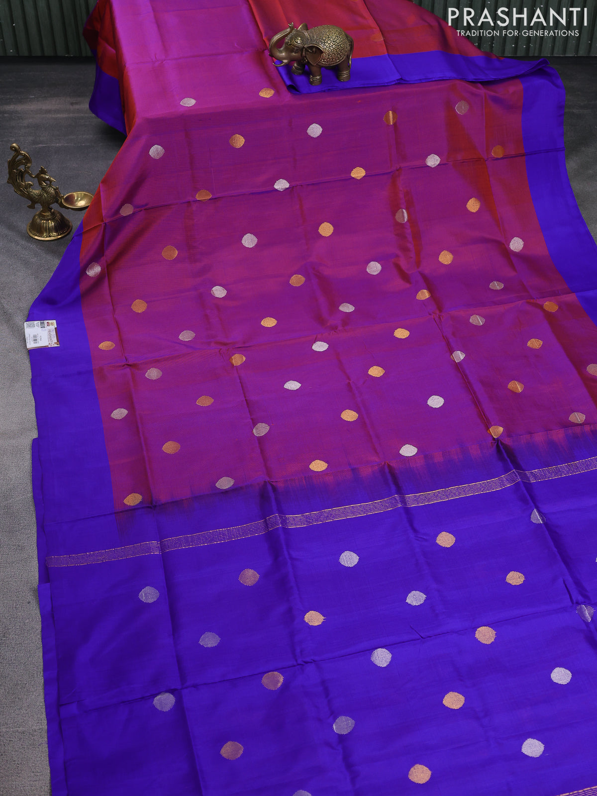 Pure uppada silk saree dual shade of reddish blue and blue with silver & gold zari woven coin buttas and simple border