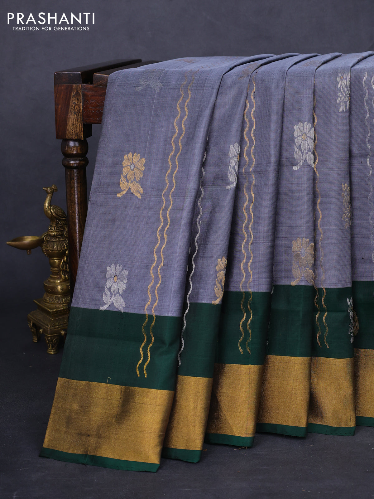 Pure uppada silk saree grey and green with silver & gold zari weaves and zari woven border