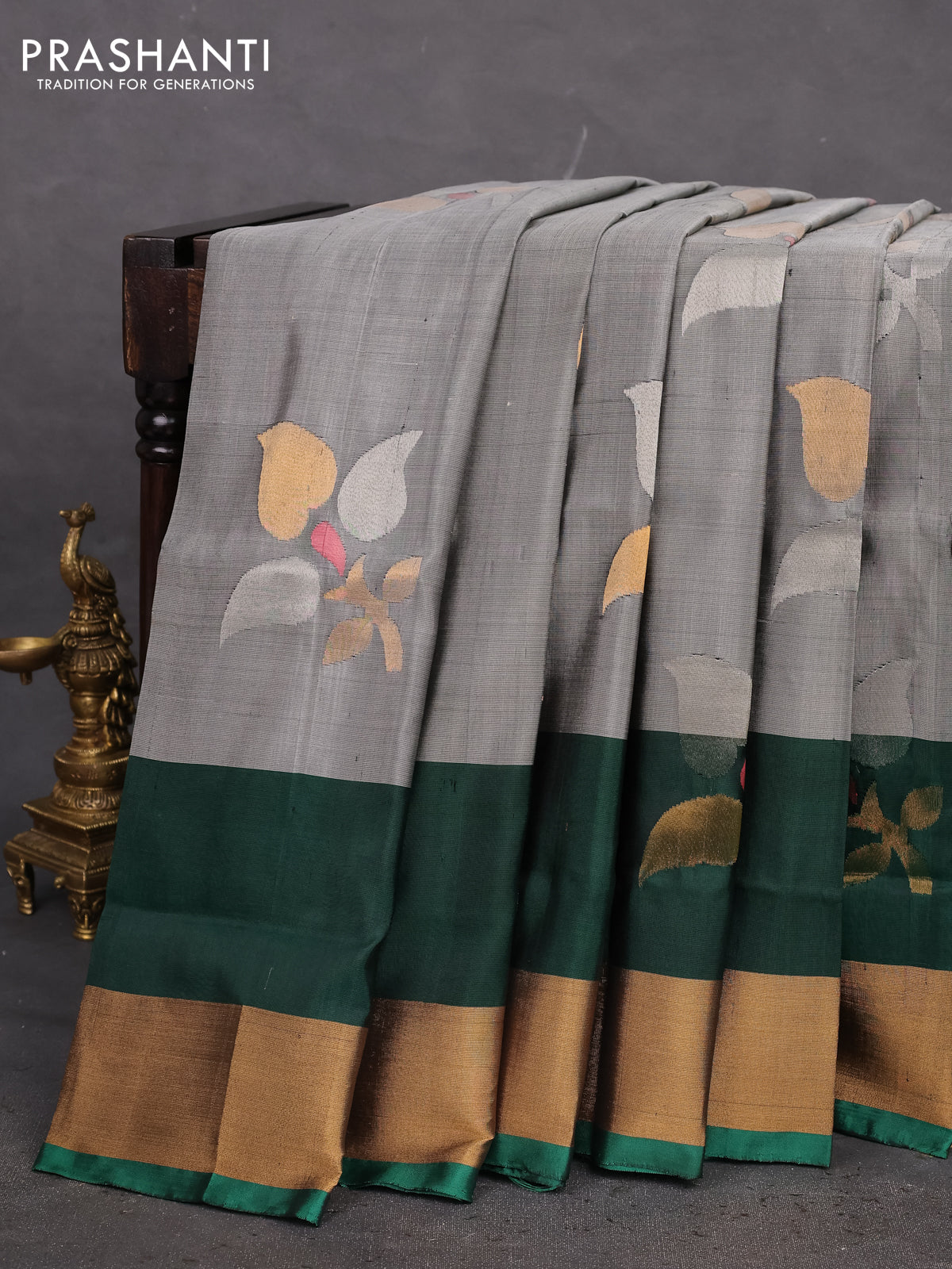 Pure uppada silk saree grey and green with zari woven jamdhani design buttas and zari woven border