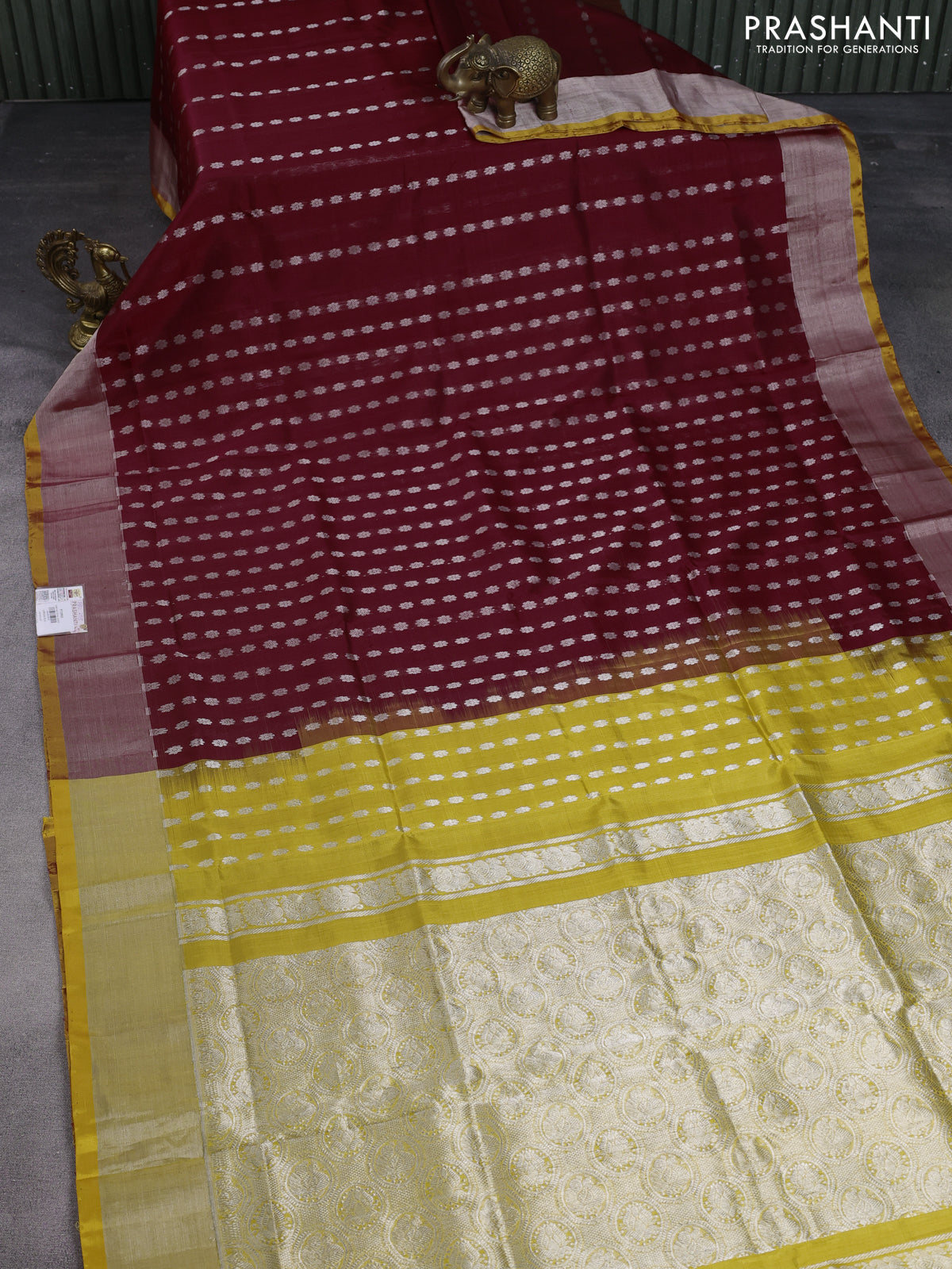 Pure uppada silk saree maroon and yellow with allover silver zari woven buttas and zari woven border