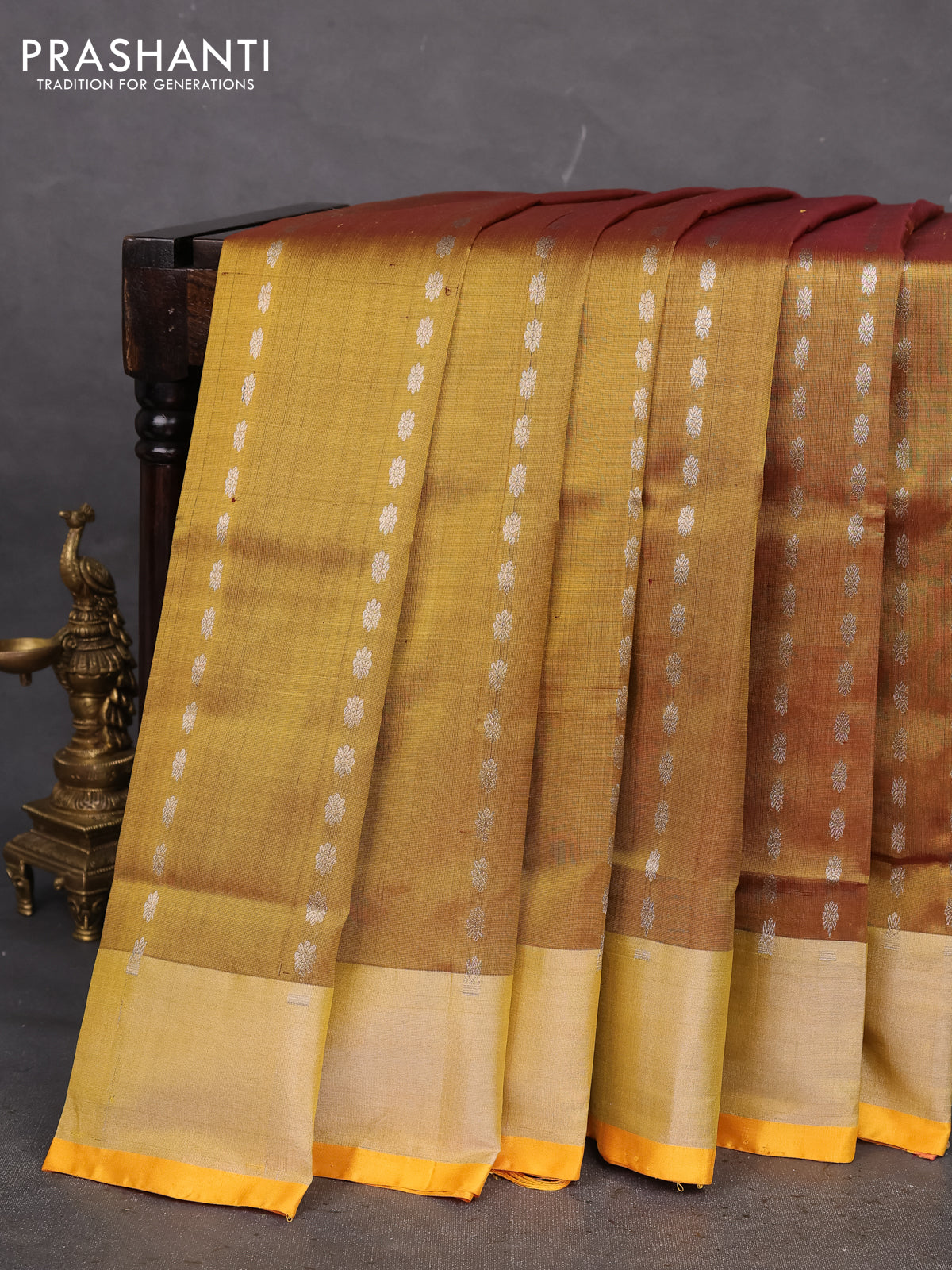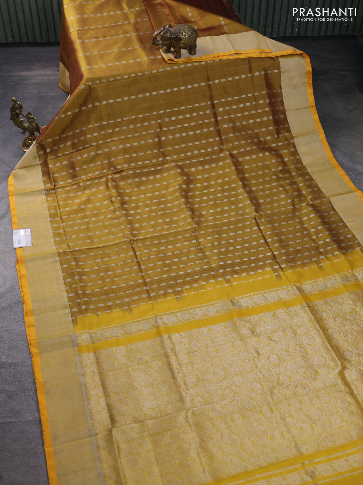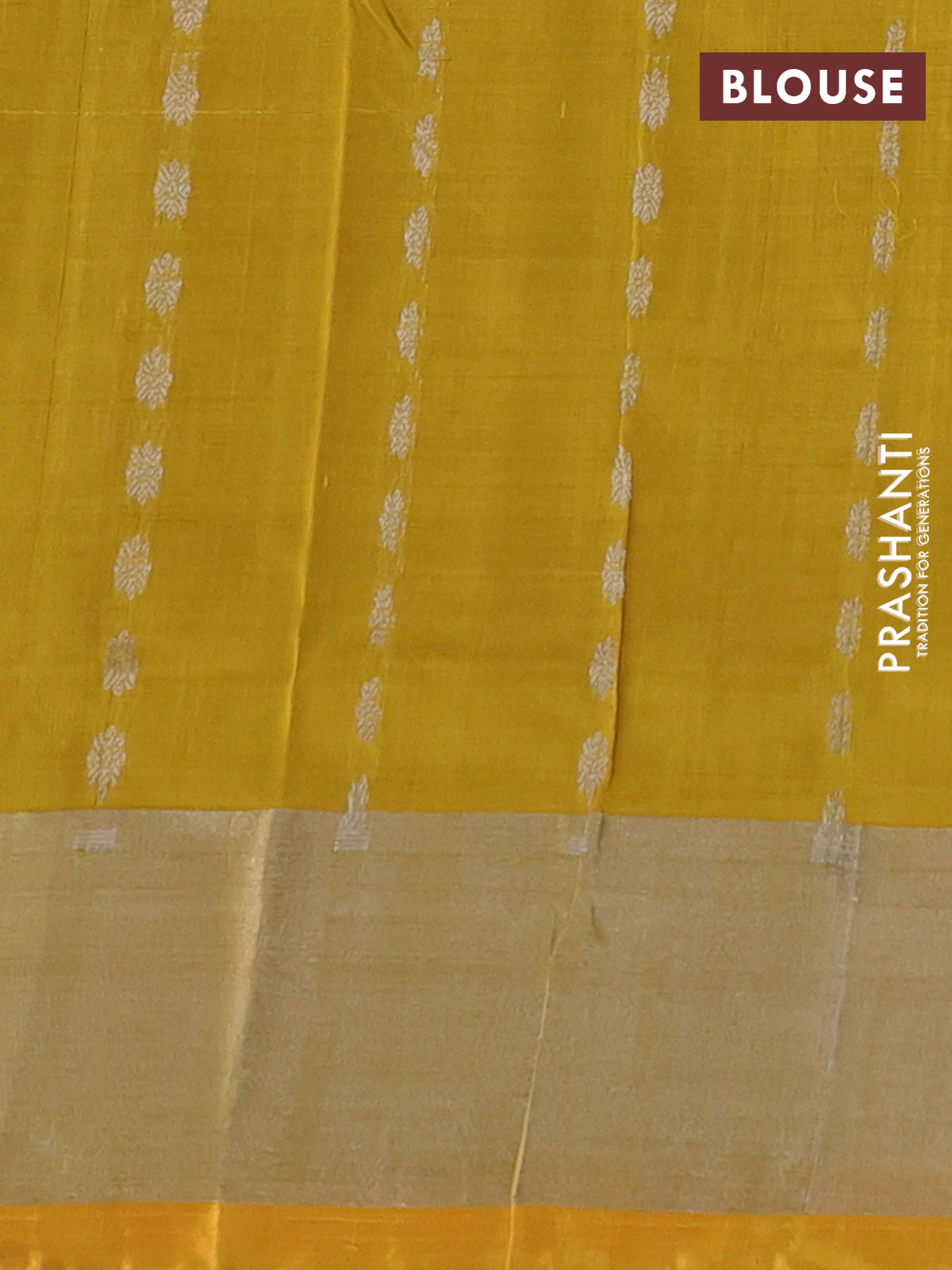 Pure uppada silk saree mustard shade and yellow with allover silver zari woven buttas and zari woven border