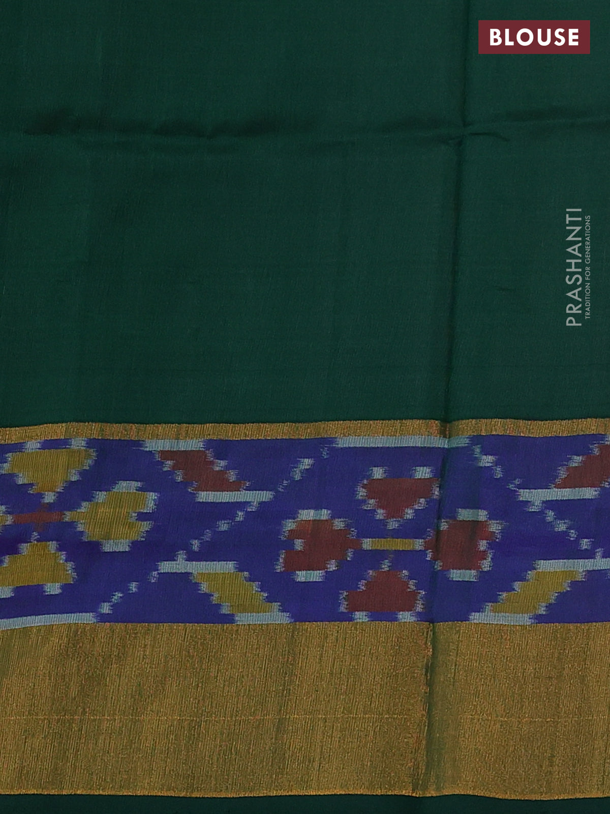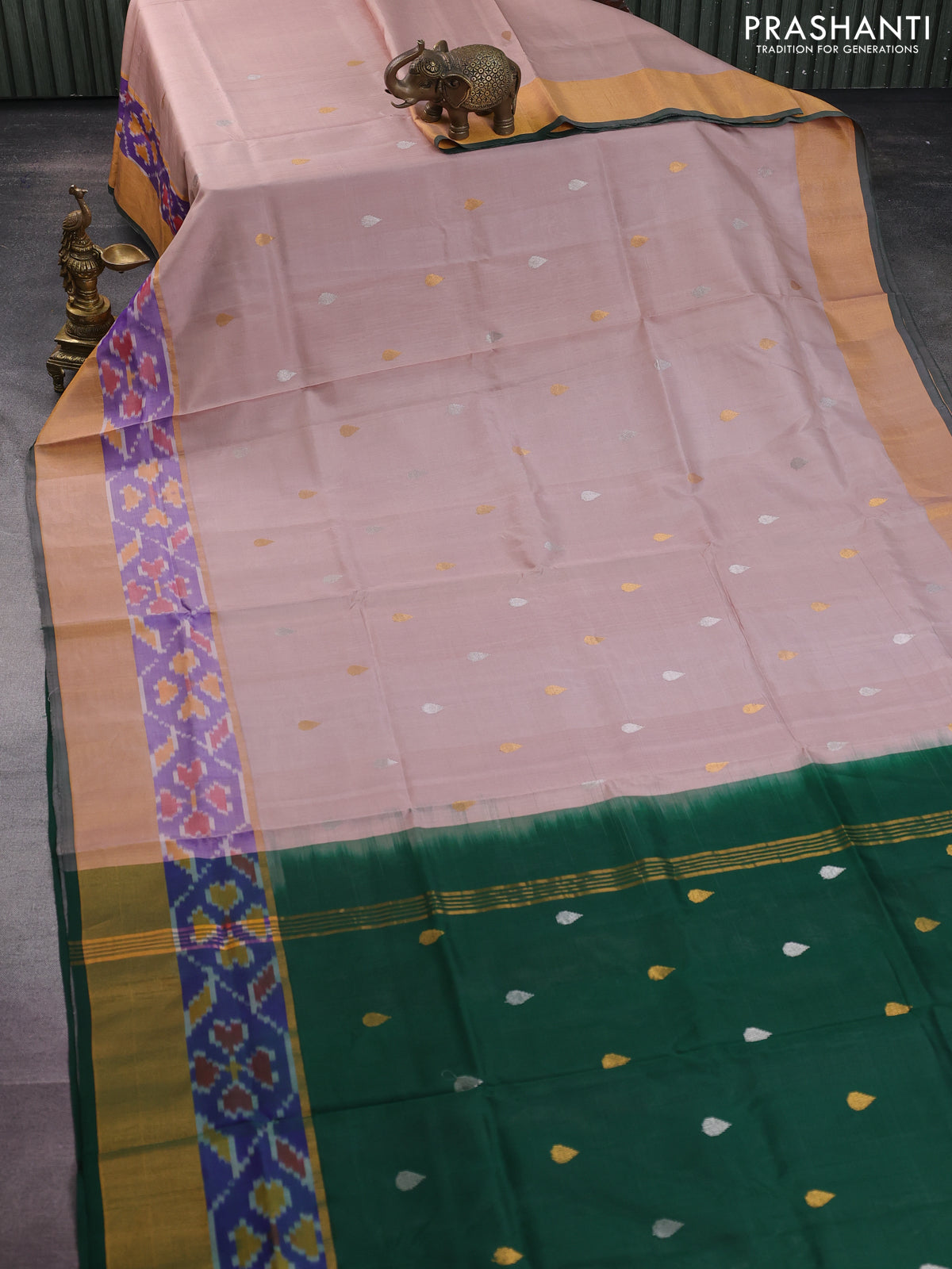 Pure uppada silk saree pastel peach shade and dark green with silver & gold zari woven thilak buttas and zari woven ikat style border