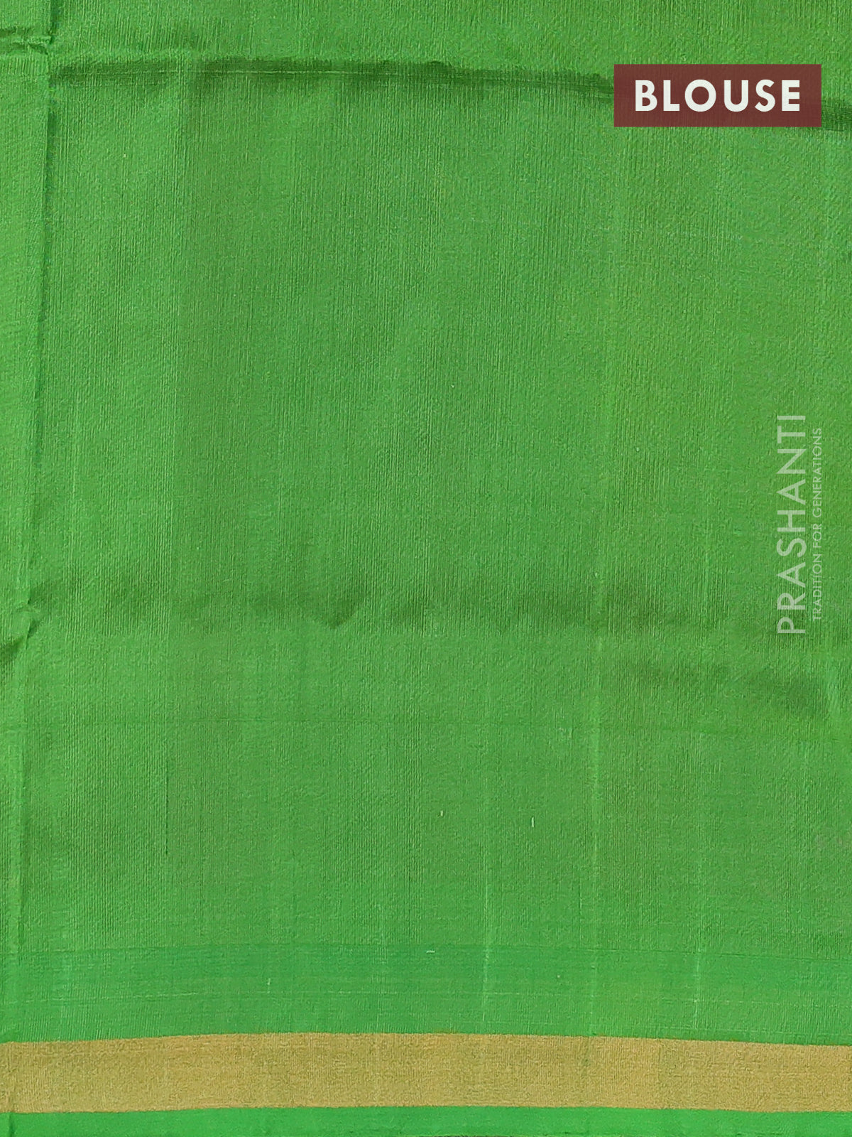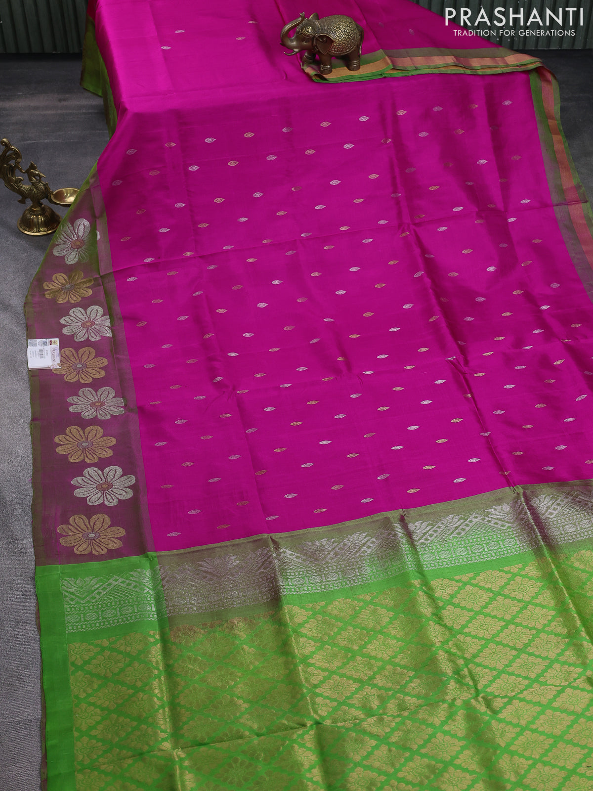 Pure uppada silk saree pink and parrot green with allover silver & gold zari woven buttas and zari woven floral butta border