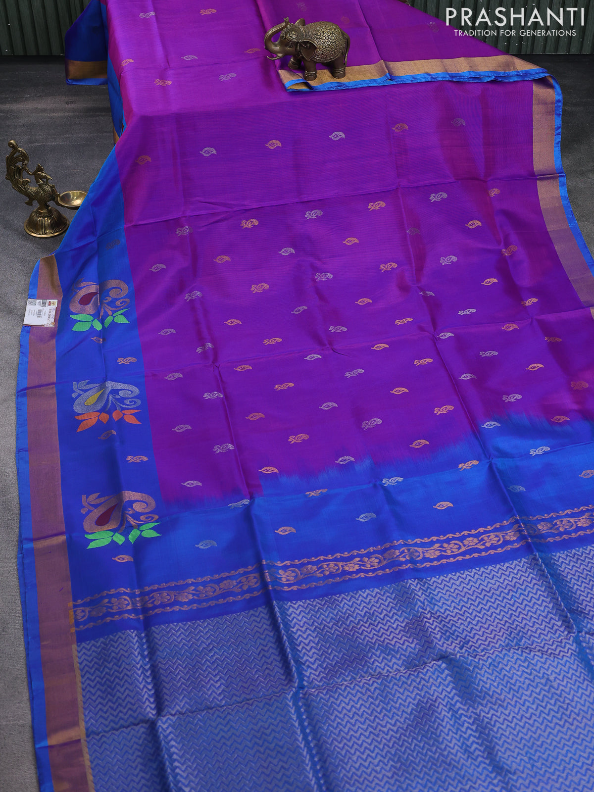 Pure uppada silk saree purple and cs blue with silver & gold zari woven buttas and paisley design zari woven border