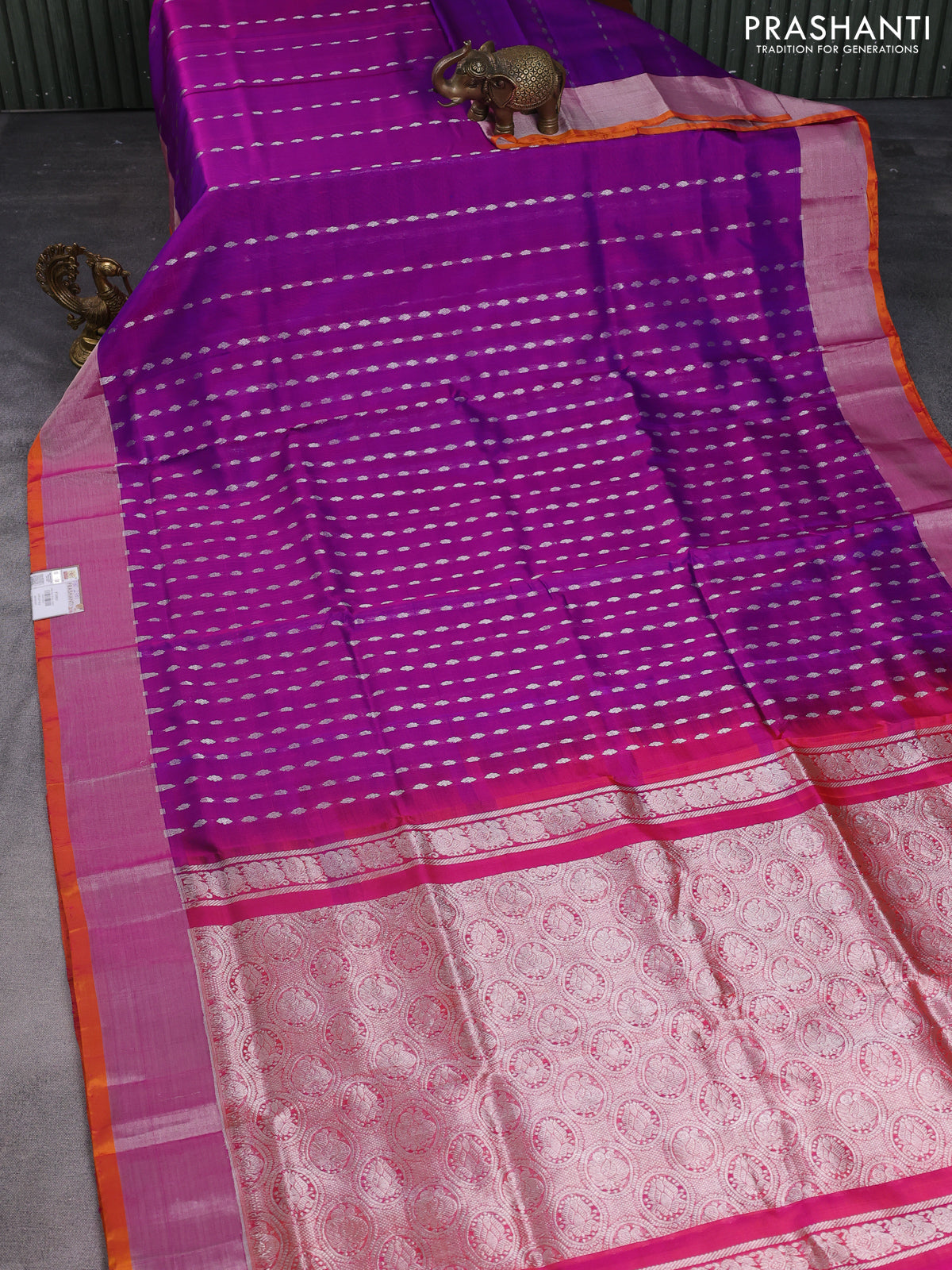 Pure uppada silk saree purple and dual shade of pinkish orange with allover silver zari woven buttas and zari woven border