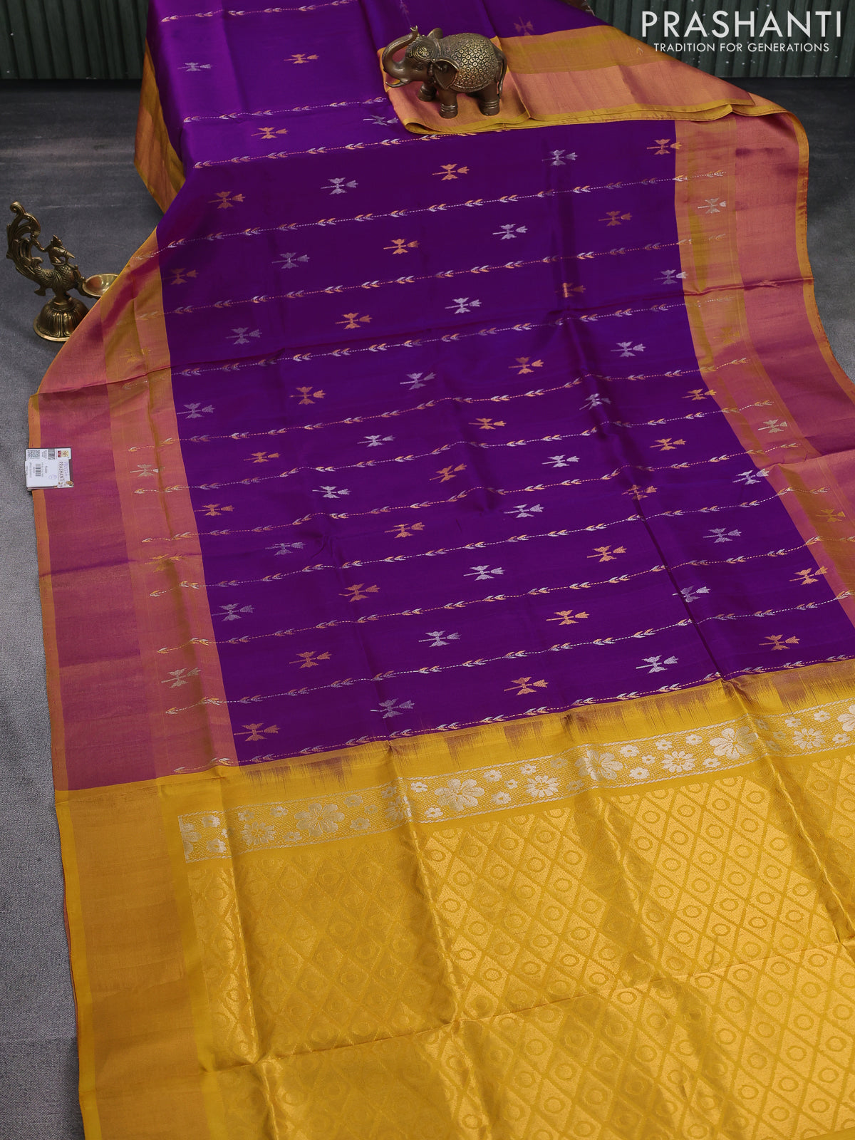 Pure uppada silk saree purple and mustard yellow with allover silver & gold zari weaves and zari woven border