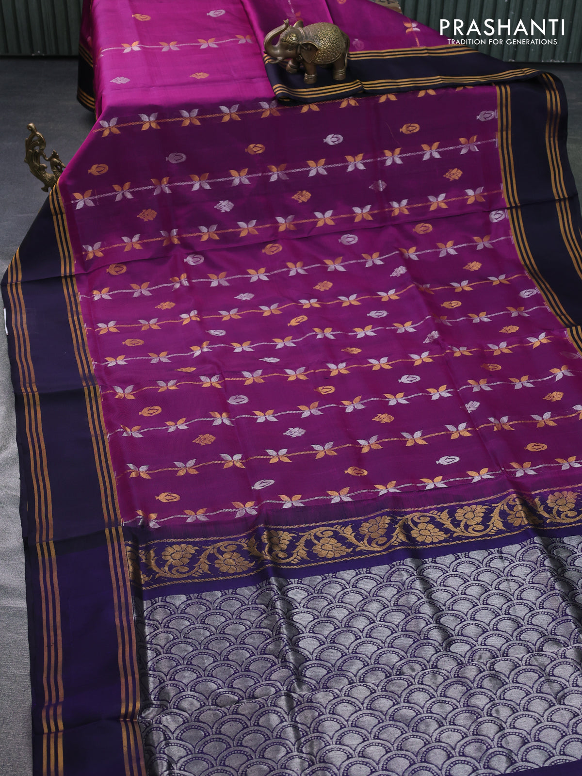 Pure uppada silk saree purple and navy blue with allover silver & gold zari weaves and rettapet zari woven border
