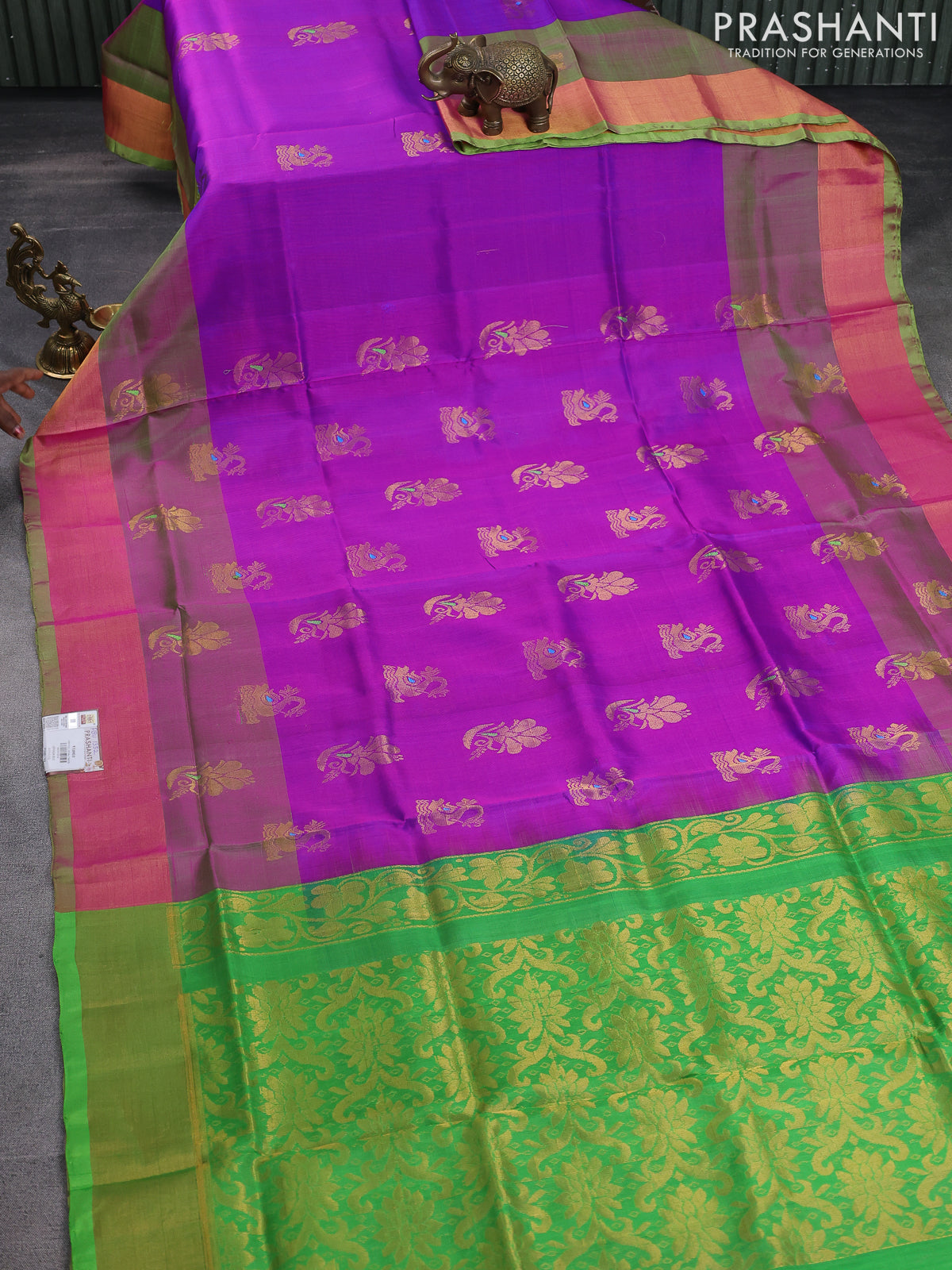 Pure uppada silk saree purple and parrot green with zari woven buttas and zari woven border