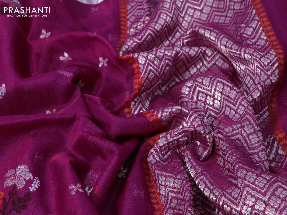 Pure zari kota silk saree magenta pink and blue with thread & silver zari woven floral buttas and silver zari woven border