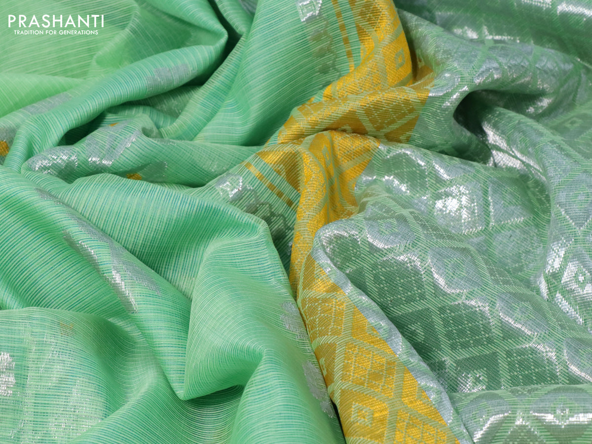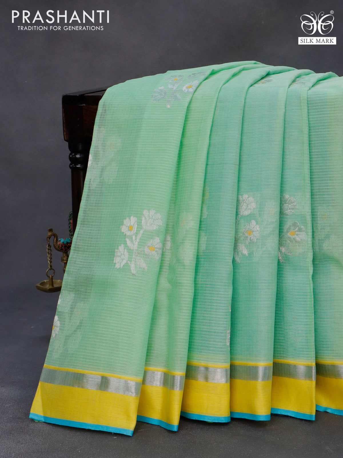 Pure zari kota silk saree pastel green and light blue yellow with thread & zari woven floral buttas and silver zari woven simple border