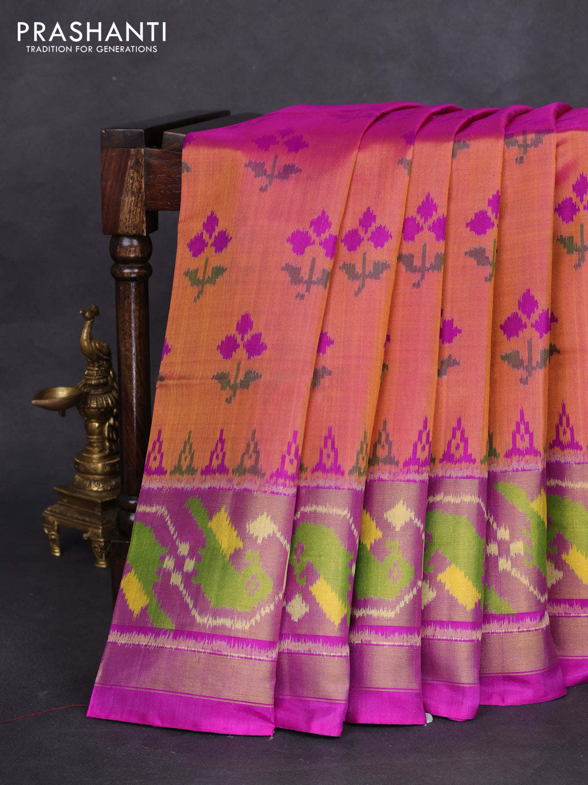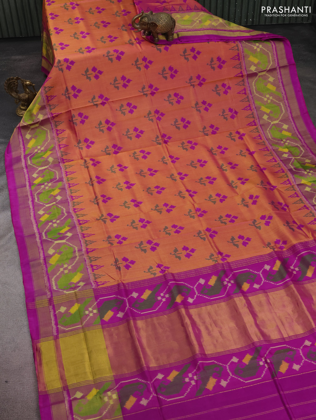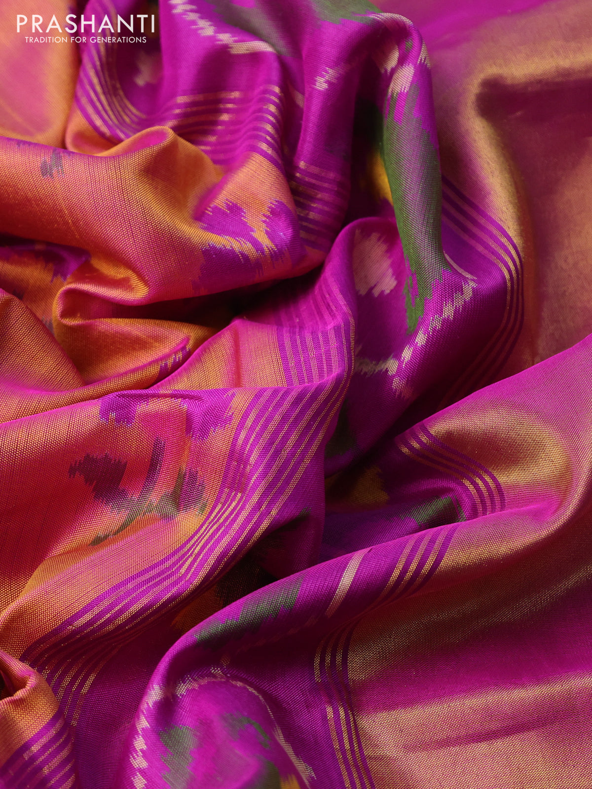 Rajkot patola silk saree dual shade of mustard yellow and purple with allover ikat weaves and long zari woven border
