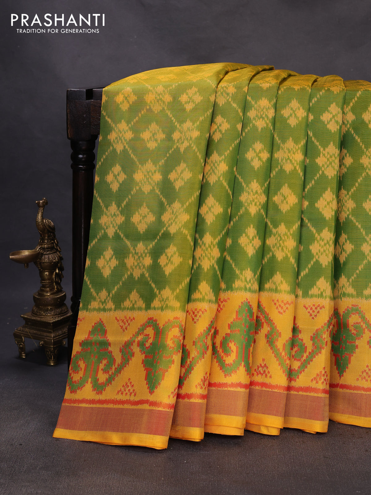 Rajkot patola silk saree green and yellow with allover ikat weaves and ikat woven zari border