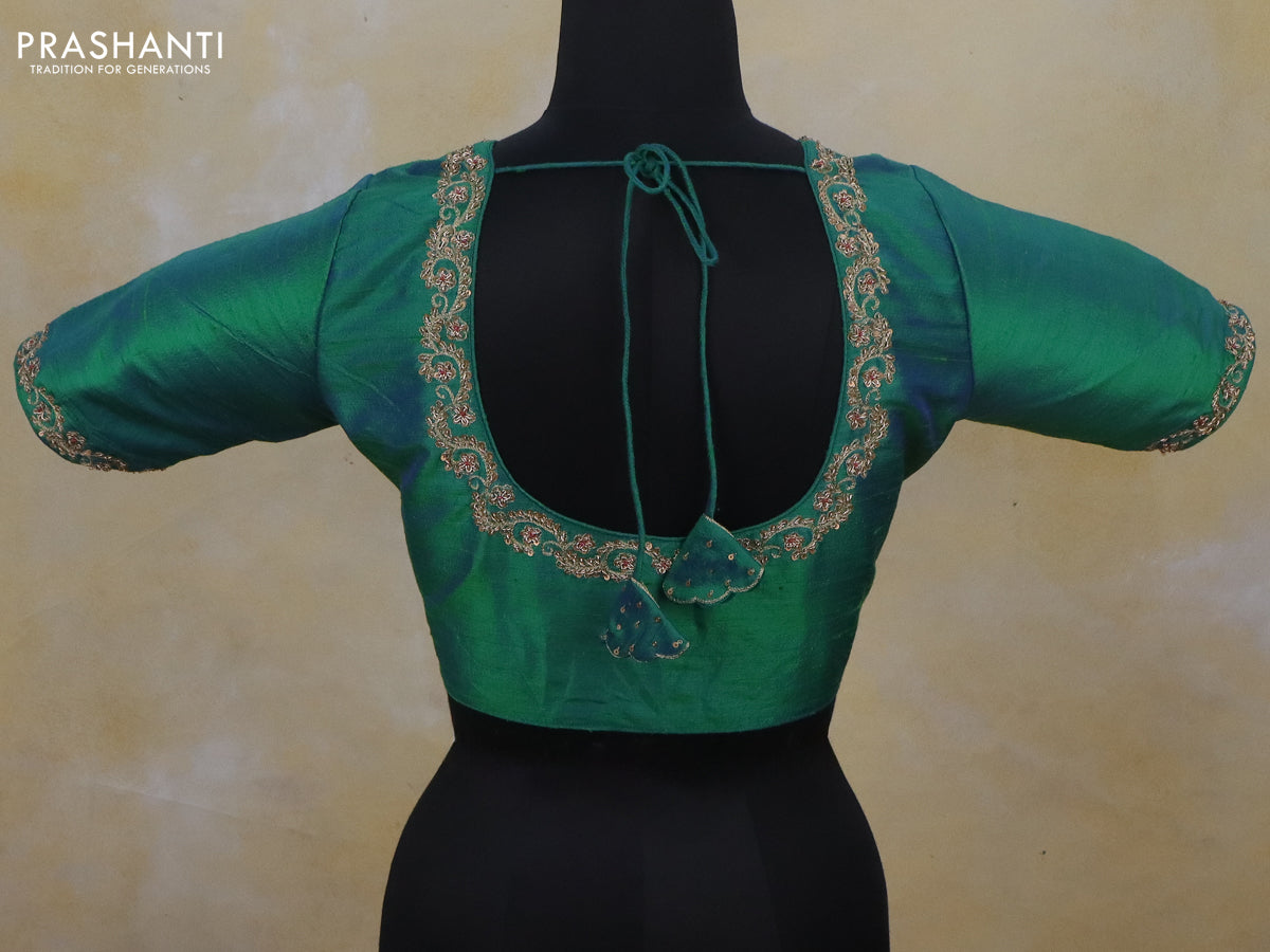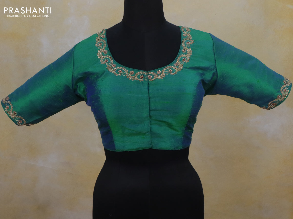 Raw silk readymade blouse dual shade of teal green with zardosi work and back knot