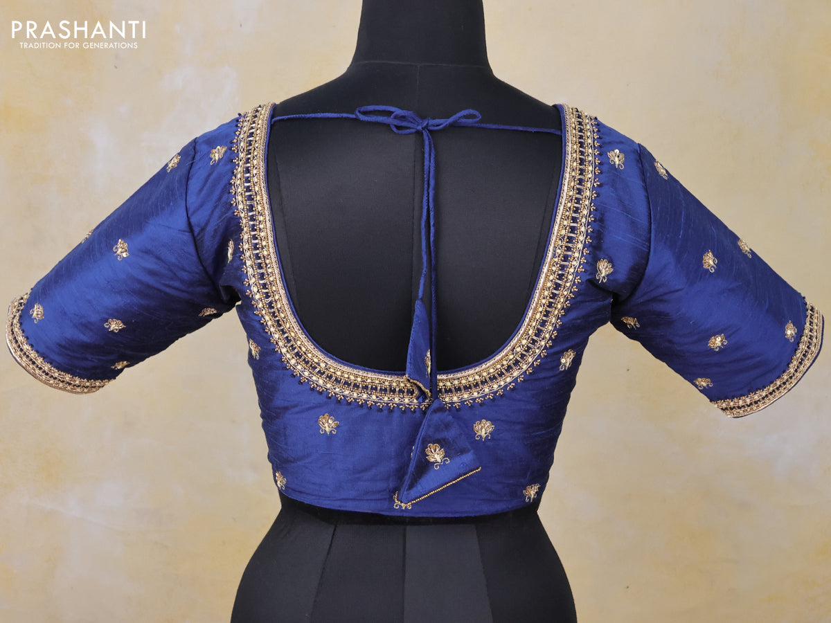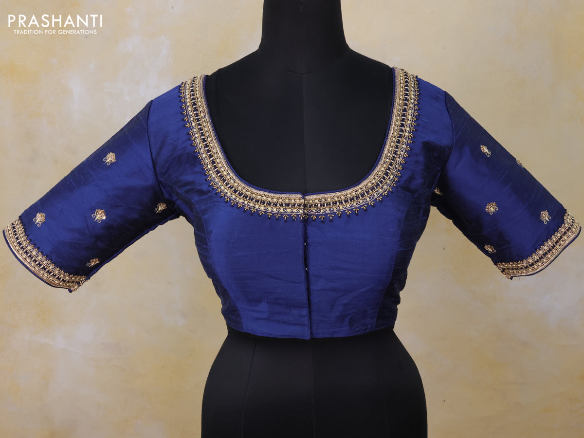 Raw silk readymade blouse navy blue with zardosi work and front hook pattern