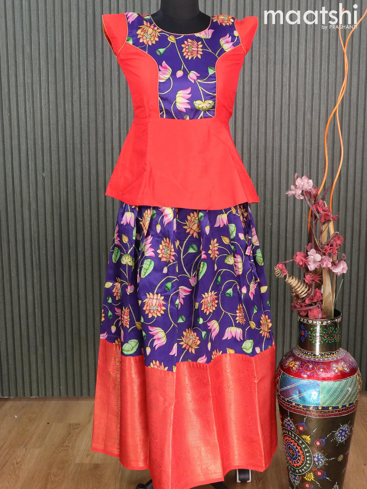 Raw silk readymade kids lehenga red and dark blue with patch work neck pattern and kalamkari prints & long zari woven border for 12 years