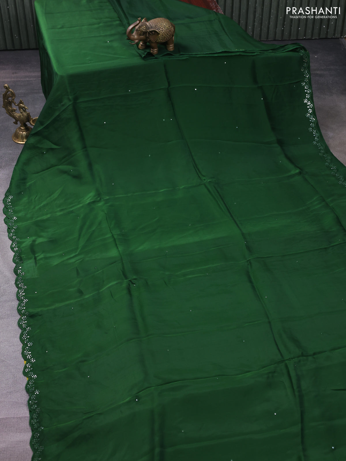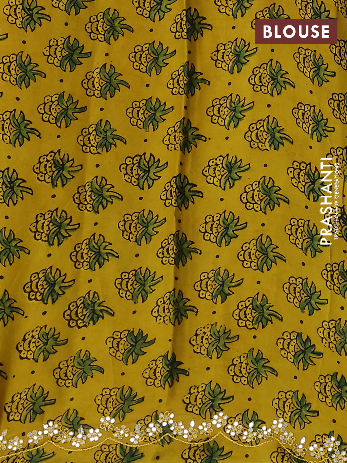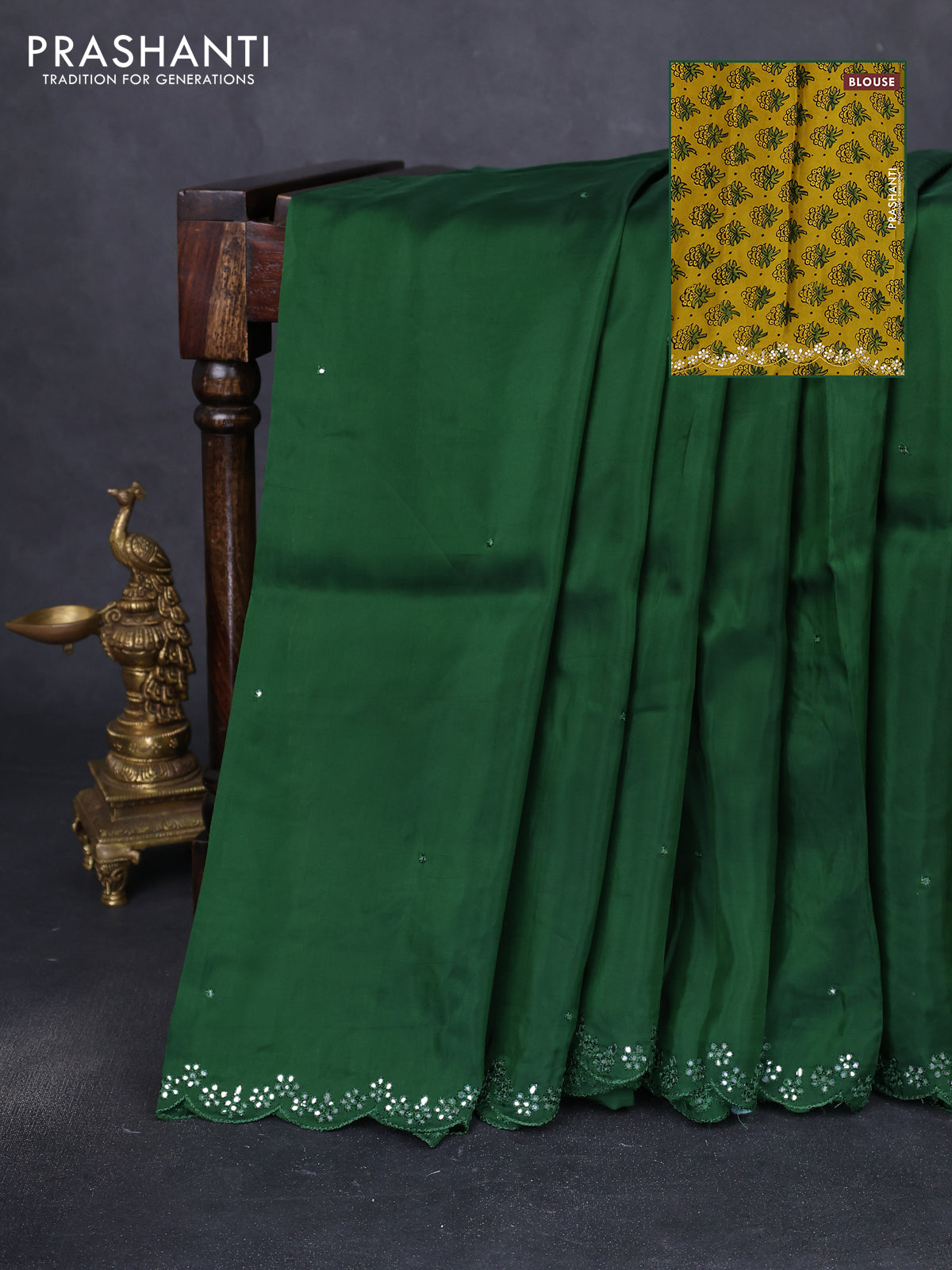 Satin crepe silk saree green and yellow with allover mirror work and ajrakh printed blouse