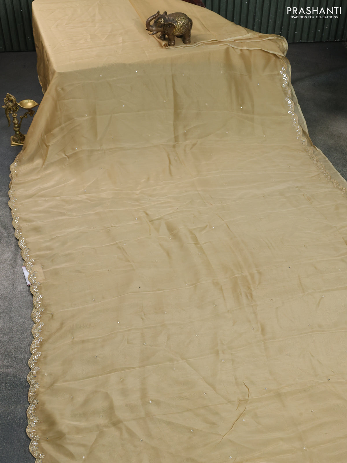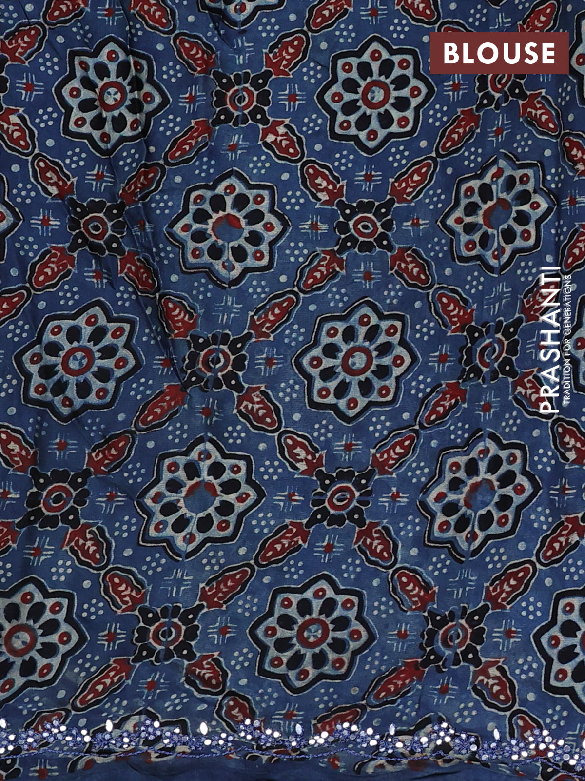Satin crepe silk saree sandal and blue with mirror work and ajrakh printed blouse
