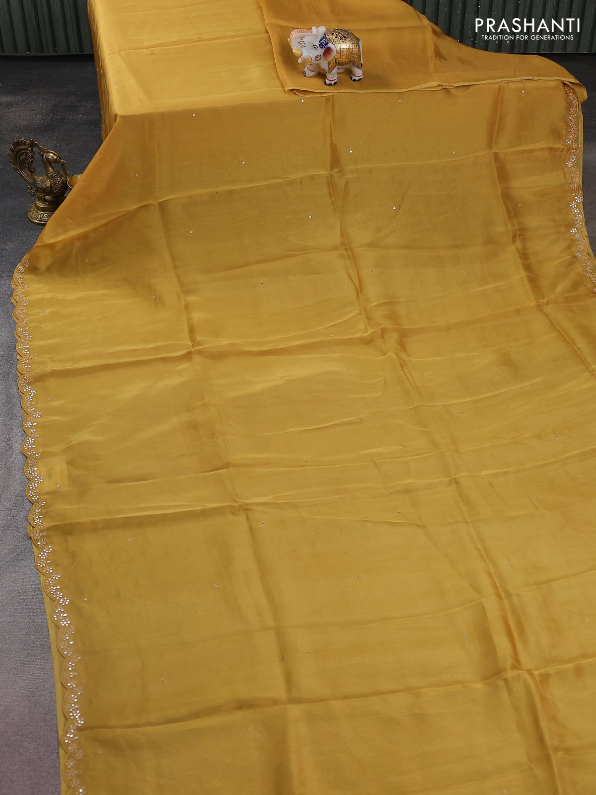 Satin crepe silk saree yellow and green with allover mirror work and ajrakh printed blouse