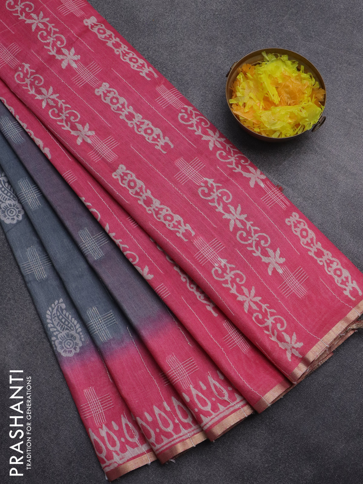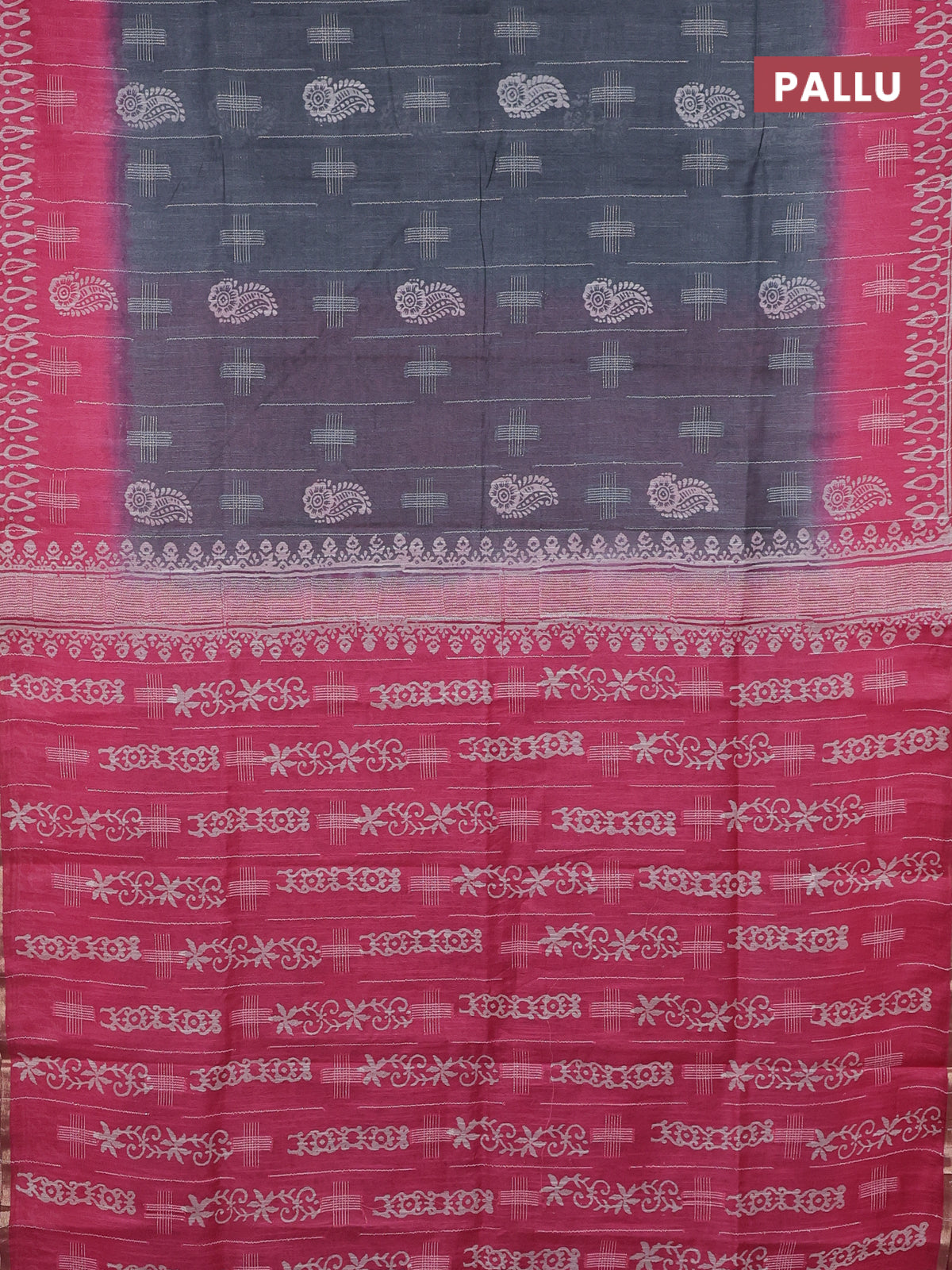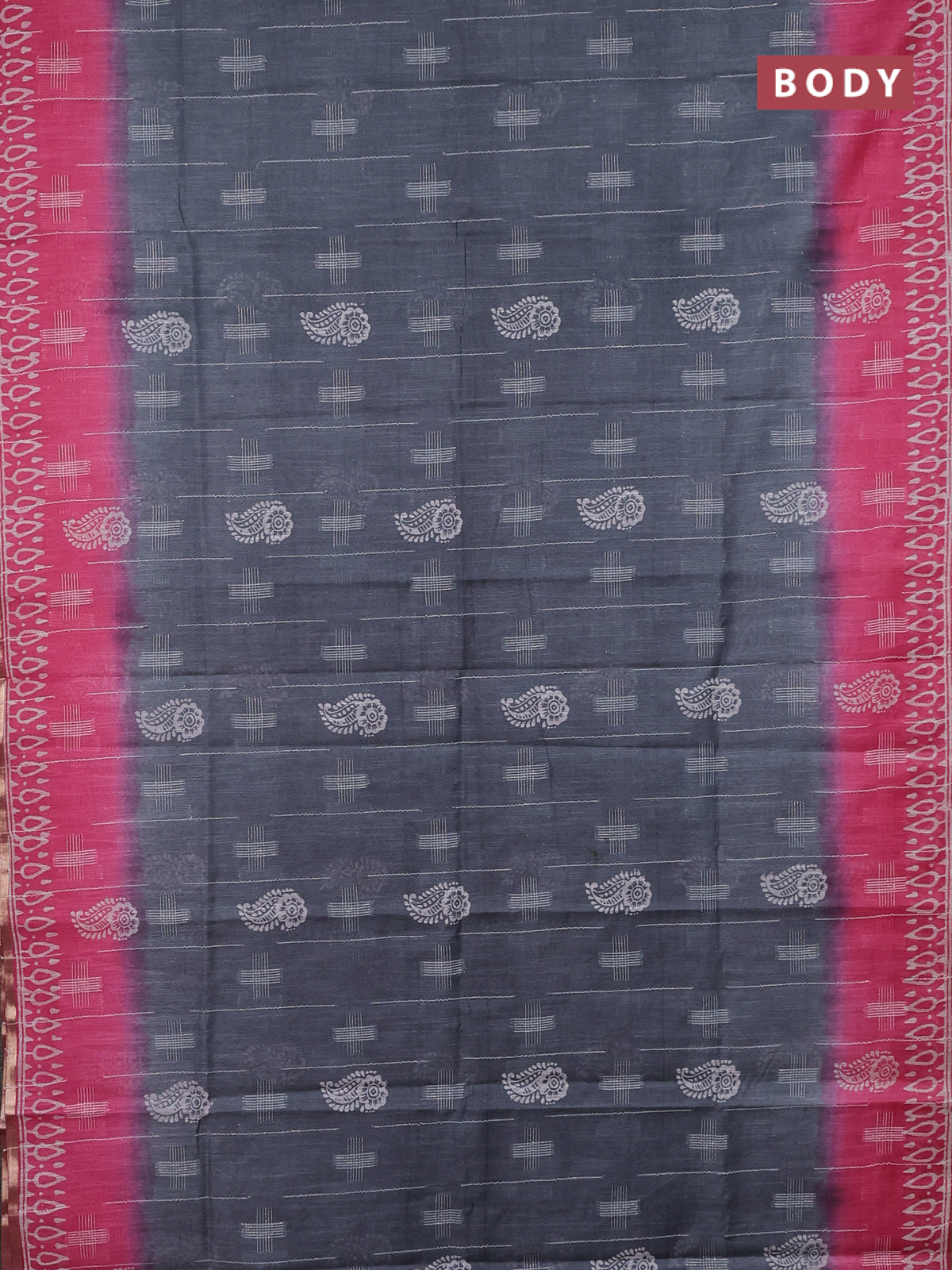 Semi bamboo saree grey and candy pink with allover thread weaves & butta prints and zari woven piping border